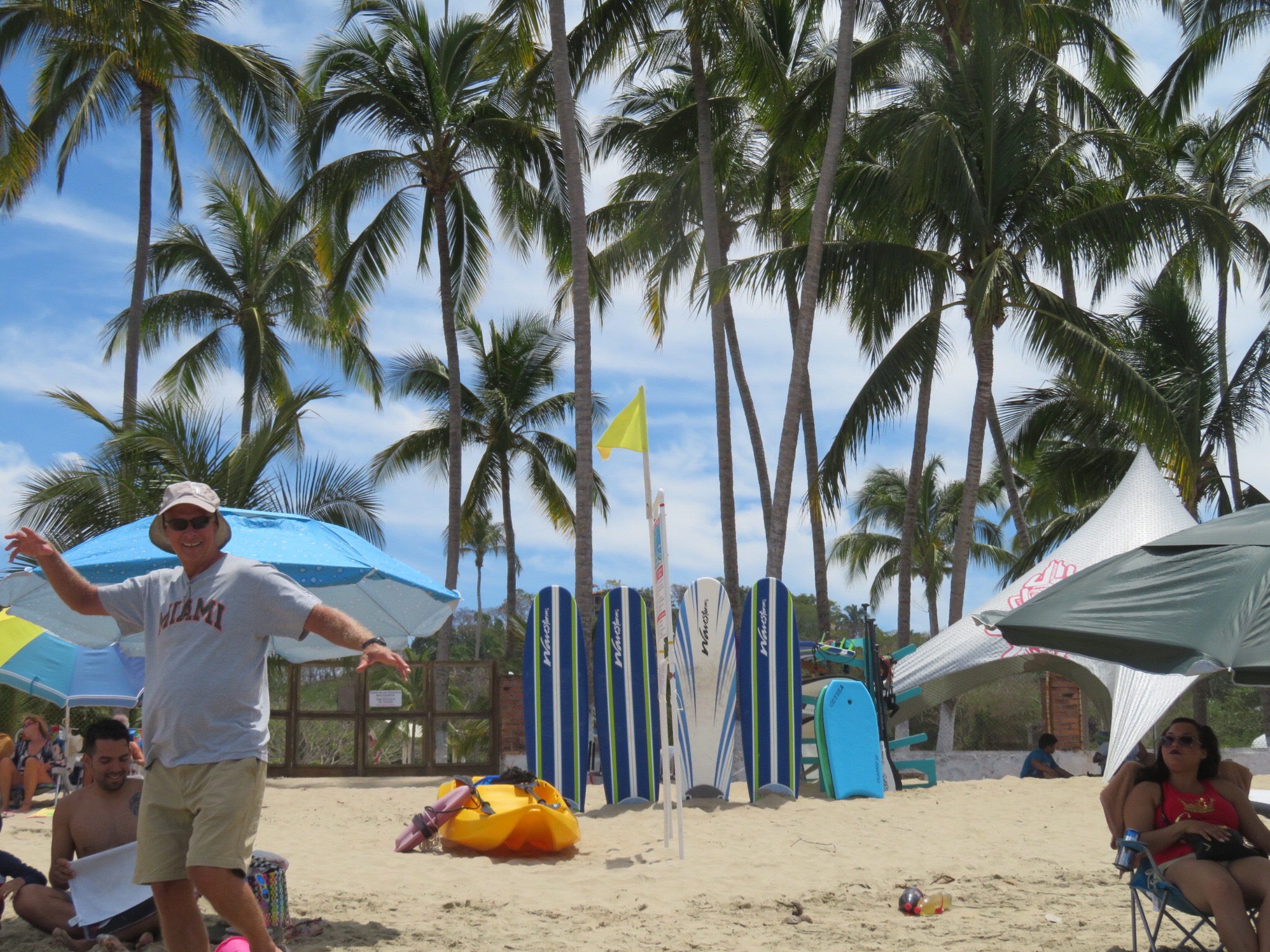 We rested a while getting ready for our trip into Bucerias later tonight. At 3:00, we braved a foray out to the beach. We weaved our way through all of the campers down to the patio where the open mike is usually set up. The families camping here have turned the area into a big kitchen area for everyone. Meals were being cooked up and over at the bar, Nancy and Maga were supplying cold beers to the thirsty visitors. Maga had a few of her artwork creations hanging on the palapa so PJ picked one out and bought it. Support your local artists!
