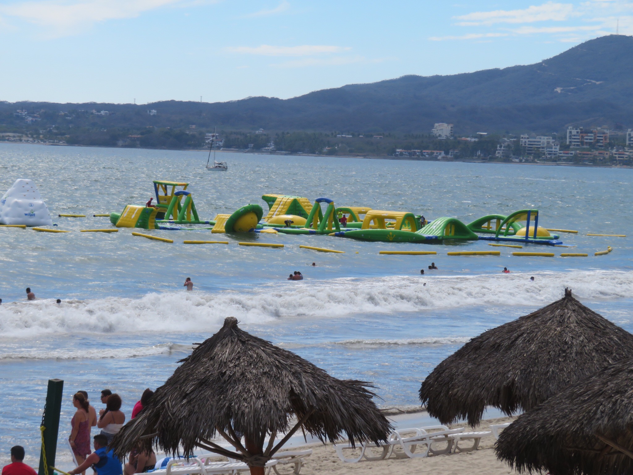I swam in, rounded up PJ and the dogs then rinsed off and put on a collared shirt. We walked into town and caught the green bus into Bucerias. We only had to wait 20 minutes and there it was. A quick and easy ride. We hopped off at the centro and wandered around checking out the beach activity in Bucerias. It was really windy which seemed to discourage the waders, but out in the open ocean, sail boarders and wind surfers were taking full advantage of the strong gusts.