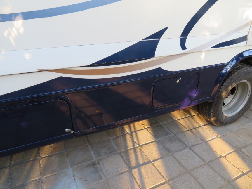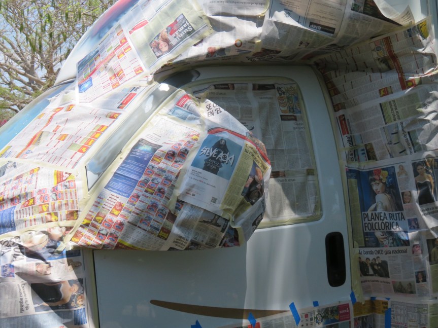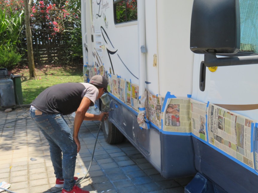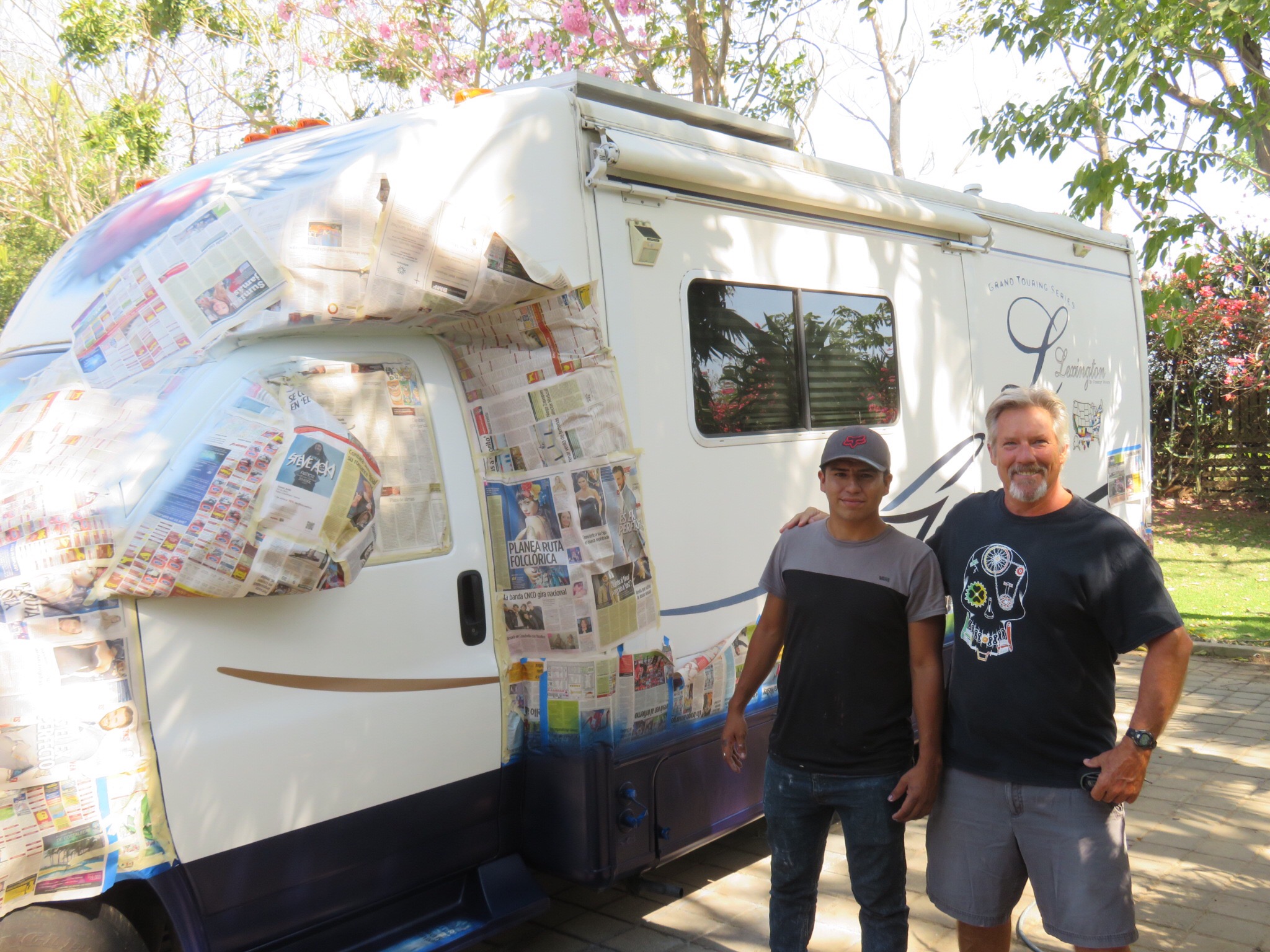 Alfredo has a friend, Cesar, who does body work so he gave him a call yesterday and Friday morning he came out and gave an estimate to paint the front door pillar where the white paint had bubbled and was flaking off. I’ve seen this on a large number of Chevy vans from the 2000s. Must be a factory thing where they were trying to save a buck on the paint job. While he was looking at that, I asked him about the bluish purple stripe along the bottom of the coach where the clear coat had disintegrated and was coming off in flakes. He gave me a price of 3000 pesos for everything and I told him to go ahead and get started. He and a worker got most of the prep work done that afternoon.