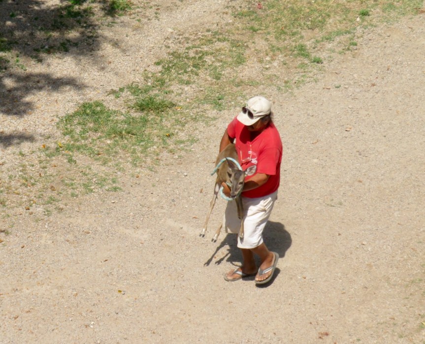 Today, we slept super late having had a hard night sleeping. Cali was fidgeting and some loud music was floating in on the breeze from somewhere towards town. Had a nice stroll, then sat in the palapa area down by the beach before going up and eating a leisurely brunch on the balcony. I was watching the deer cautiously grazing around the RV sites when Nancy came walking down with a large gentleman in a red shirt. It turns out that Bambi was indeed acting so tamely because she is somebodies pet and this particular character was that guy. He carried her bleating, a hauntingly human sounding cry, as she squirmed and tried to free herself from his grasp. They loaded her into a pick up truck and drove down the trail kicking up a cloud of dust. I heard the guy calling out to the deer as he was rounding her up. Guess what the true name is, you guessed it, Bambi. Originality is not always at a premium out here in the campo. Hung around on the deck reading my book and taking it lazy today. Dogs too, they have no problem napping all day. A shiftless bunch if there ever was one.