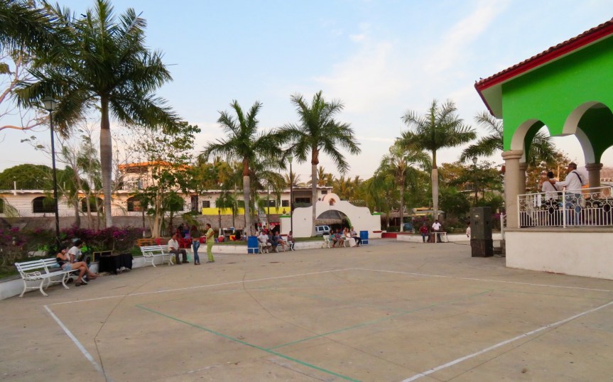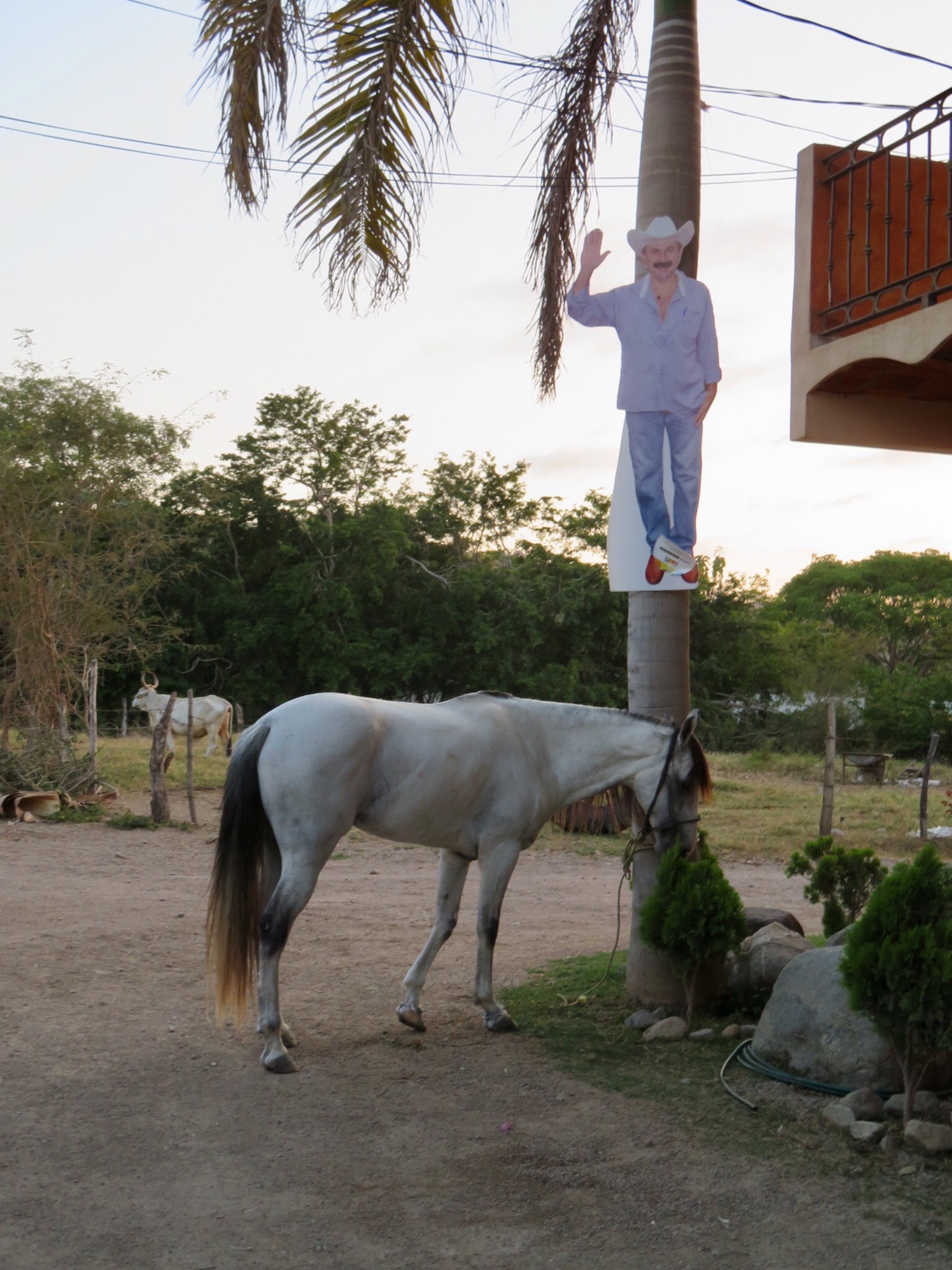 Later in the evening, walked the dogs into town to see what the Wednesday happenings were in the plaza. Passing by El Caracol, lilies are coming onto bloom in the little ponds out front. The band in the center was just kicking off a set when we arrived, so I stayed for a few songs. The crowd was small and not too enthusiastic. Two older women were dancing but no one else was looking to join in. The singer came down off the stage to sing with the audience hoping to get them worked up. Gone are the glory days of the high season when the zocalo was packed. Cali wasn’t digging the drums so we took some back streets home. Lots of people out. Kids playing ball in a newly mowed field and farmers tending to their livestock.