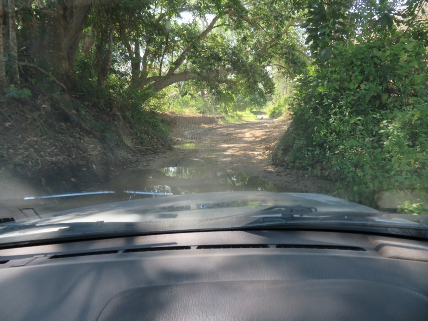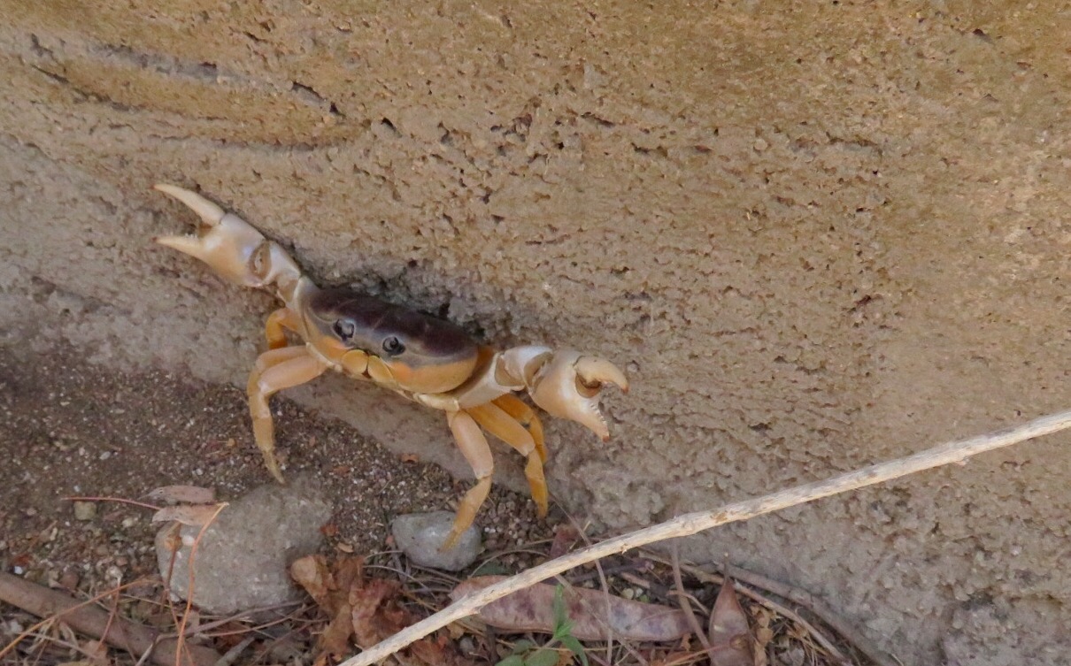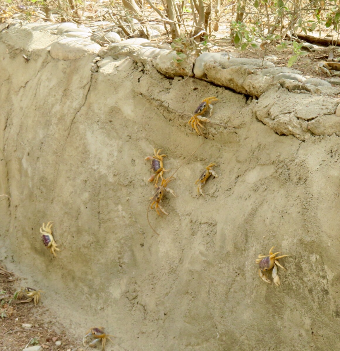 The road down to Higuera Blanca was narrow and the jungle is brown and dusty, thirsting for rain. We took the dirt road at Patzcuarito and drove until we reached the mostly dried up river. Some masons were building a well next to the road and when queried, they told us to drive down the river until it ends at the sea. Eduardo was game and dropped the Honda up to its doors in the shallow stream and bumped our way down to the land crab breeding zone. I don’t imagine we’ll be doing this when the rains start up.