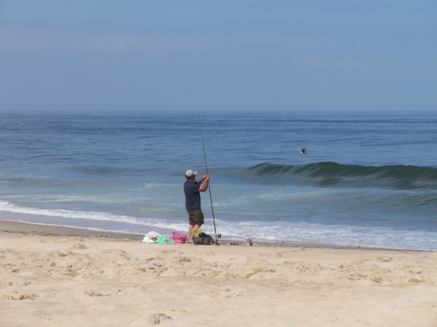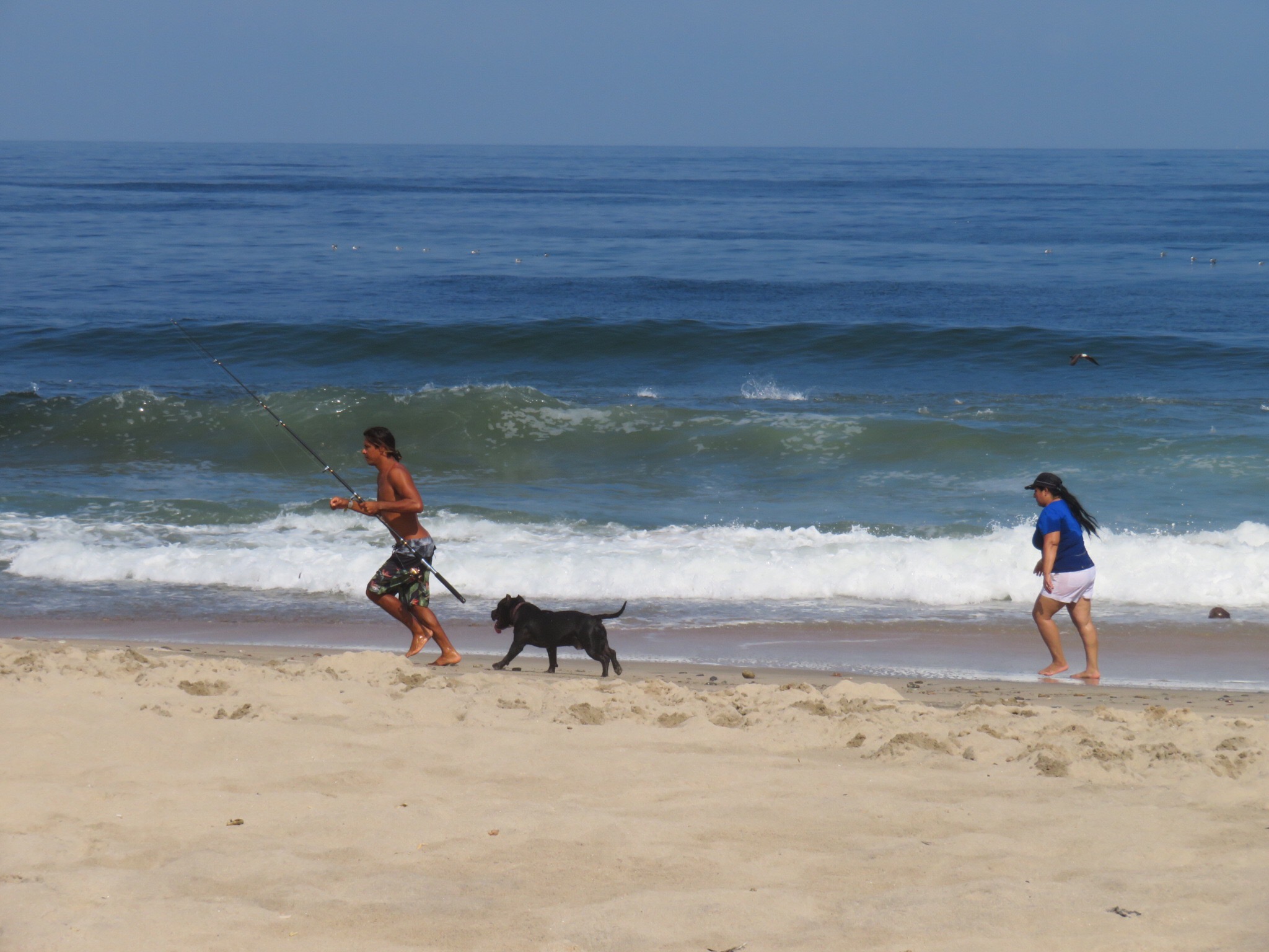 We stepped through an opening in the barbed wire and emerged on a beautiful stretch of open beach. Some locals were casting their lines into the surf trying to hook one of the many fish that were breaking the surface of the water just a stone’s throw from the shore. A hyper dog was racing back and forth bouncing his nose on the sand with every leap. Two men were catching bait in the creek by throwing rocks and stunning the small fish then racing back to their fishing poles and casting them out into the flashing schools of fish.