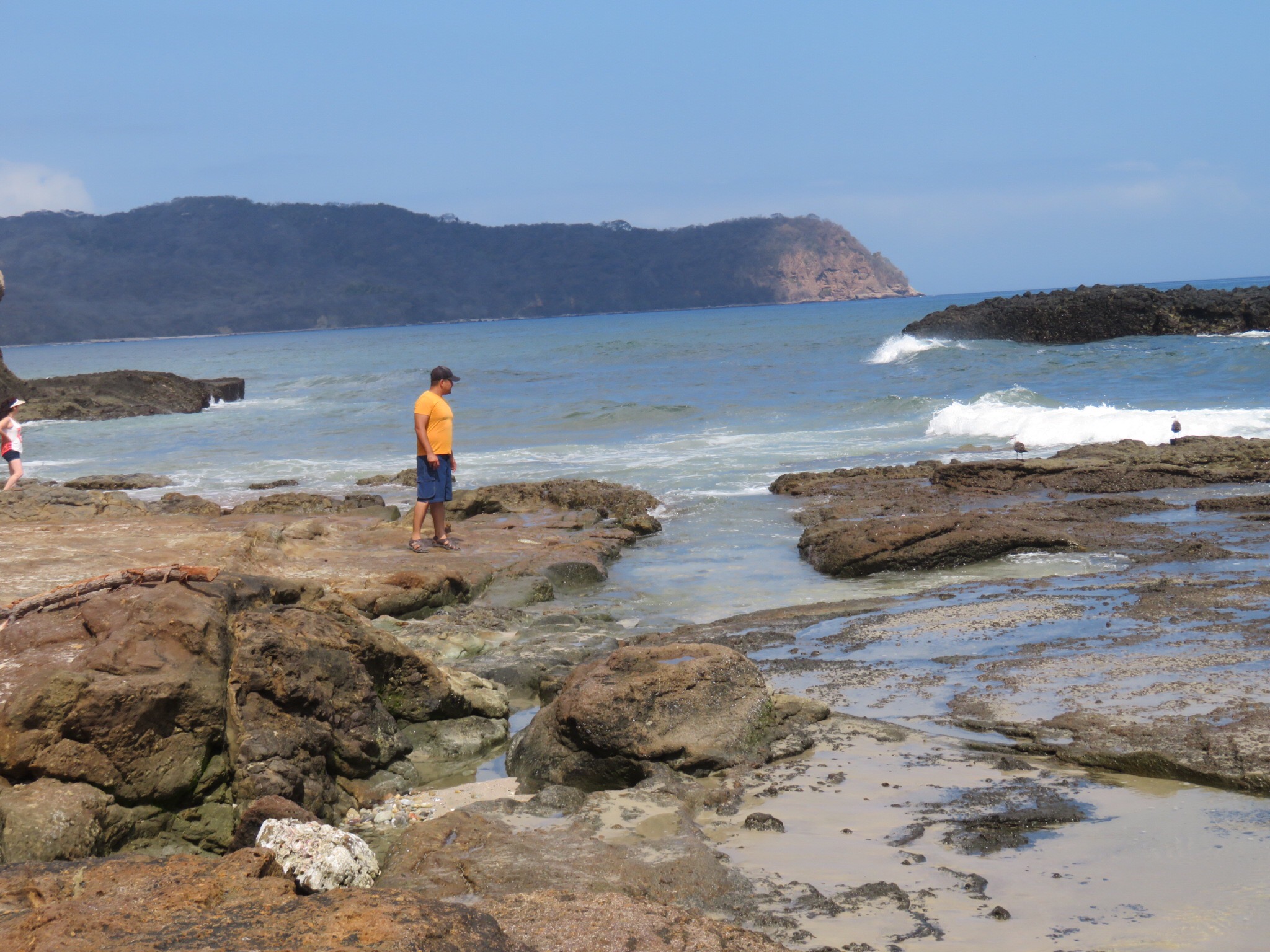 We continued down to La Lancha, where we hiked through the mangroves out to a beautiful beach at the end. There were some small waves rolling in over the reef out in front. Another crowd was working a small wave a little to the west. Eduardo found a spot in the shade of the bluff and I paddled out to catch a few little waves. They would break over the rocks then quickly back off over deeper water inside. The aqua blue water was beautiful and the sun was shining. It was great just being out in the warm tropical sea. We relaxed for a while in the shade then made the hike back out to the highway. We drove across to the Oxxo and after waiting interminably for the recalcitrant clerk to finally ring up the entitled young Chilangos in front of us, we drove down to Distlladeras with some cold drinks and peanuts.