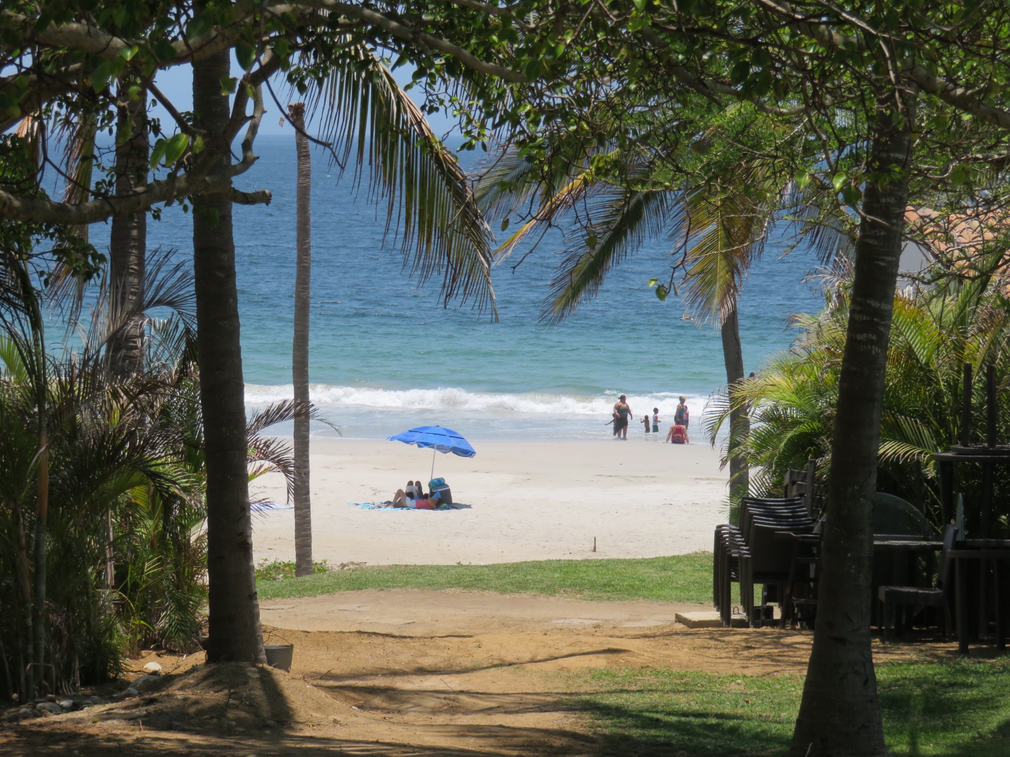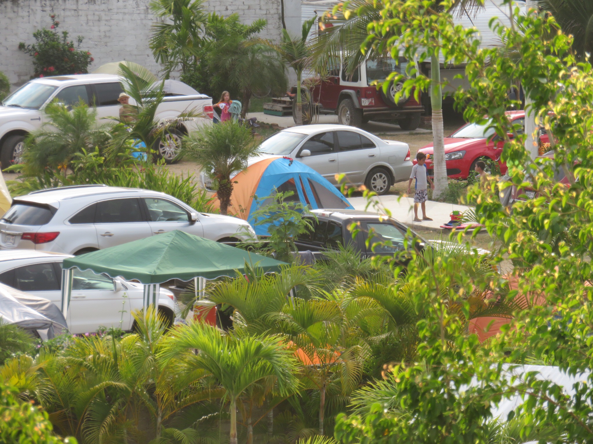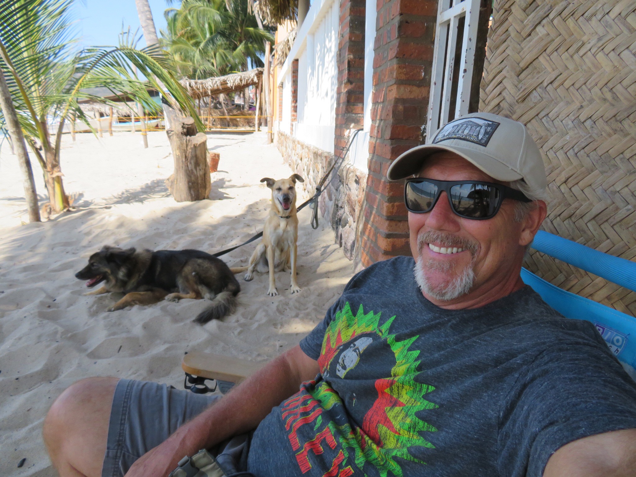 Thanked Eduardo for acting as chauffeur then went up and unleashed the hounds. They didn’t appear too excited about wandering around in the afternoon sun, so we made it a quick walk then went out to lounge on the beach out front. There were lots of cars parked at the beach and a moderate crowd out front. I sat back in my chair and fell into a meditative state reflecting on my day. A cool breeze was blowing, the dogs were content and we watched people excited to be on a beach holiday frolicking in the sun. Doesn’t get much better. Returned to the tower, made phone calls, read and napped. There is a big group of campers at La Parota, tons of kids with flashlights chasing each other around. Lots of fun, lots of laughter. We’ve got one tent and one apt. rented in our compound. Muy tranquilo.