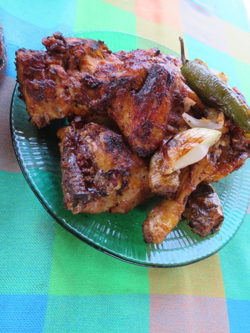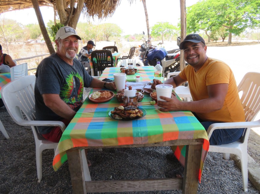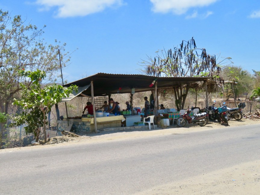 We stopped at a gritty little barbecue chicken shack on the side of the road in Higuera Blanca. There seem to be a lot of them along this stretch. Pollo Alley. We ordered up a whole chicken with plates of rice and salad and sat in the shade watching the ten year old boy run deliveries for the restaurant on his motorcycle. A bird cage full of baby rabbits decorated the shack. The chicken was hands down, the best bar-b-que chicken I’ve ever had. Eduardo claims it is the wood that they use for grilling. So, skip the fancy beachside resort, save your money and get the finest chicken in Mexico on the roadside in Higuera Blanca. Don’t mind the dust from the passing cars.