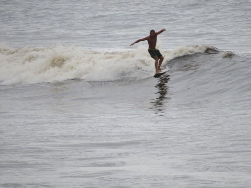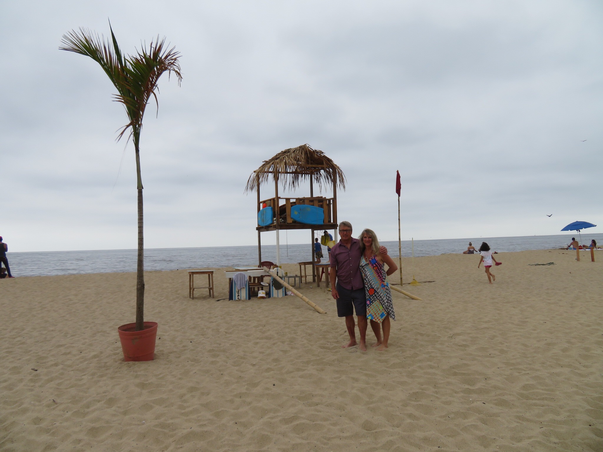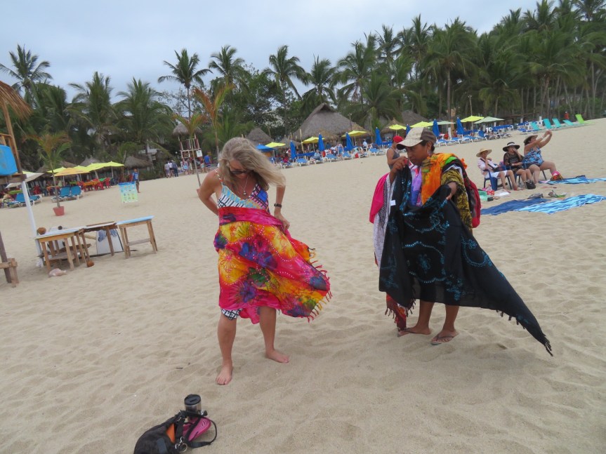 We piled into their rental car and drove down the 200 to San Francisco. Shannon parked the car on a quiet side street and we walked the few remaining blocks down to the beach. Lots of charming little shops and artsy bistro type eateries. We walked down the beach watching a couple of local kids surfing out front. A vendor came by hawking some colorful beaded sarongs and Linda couldn’t help but bargain with the lady for a brightly patterned wrap.