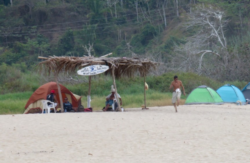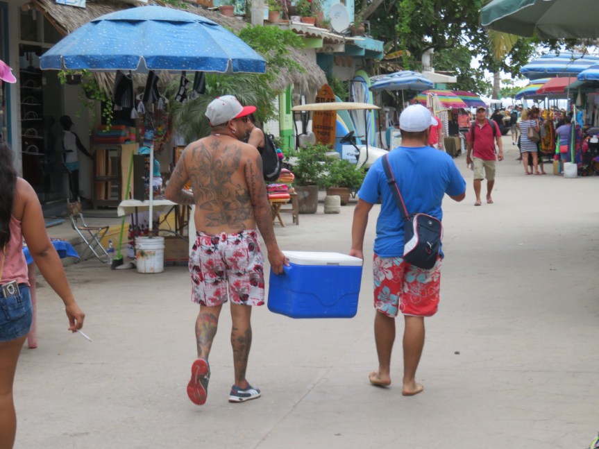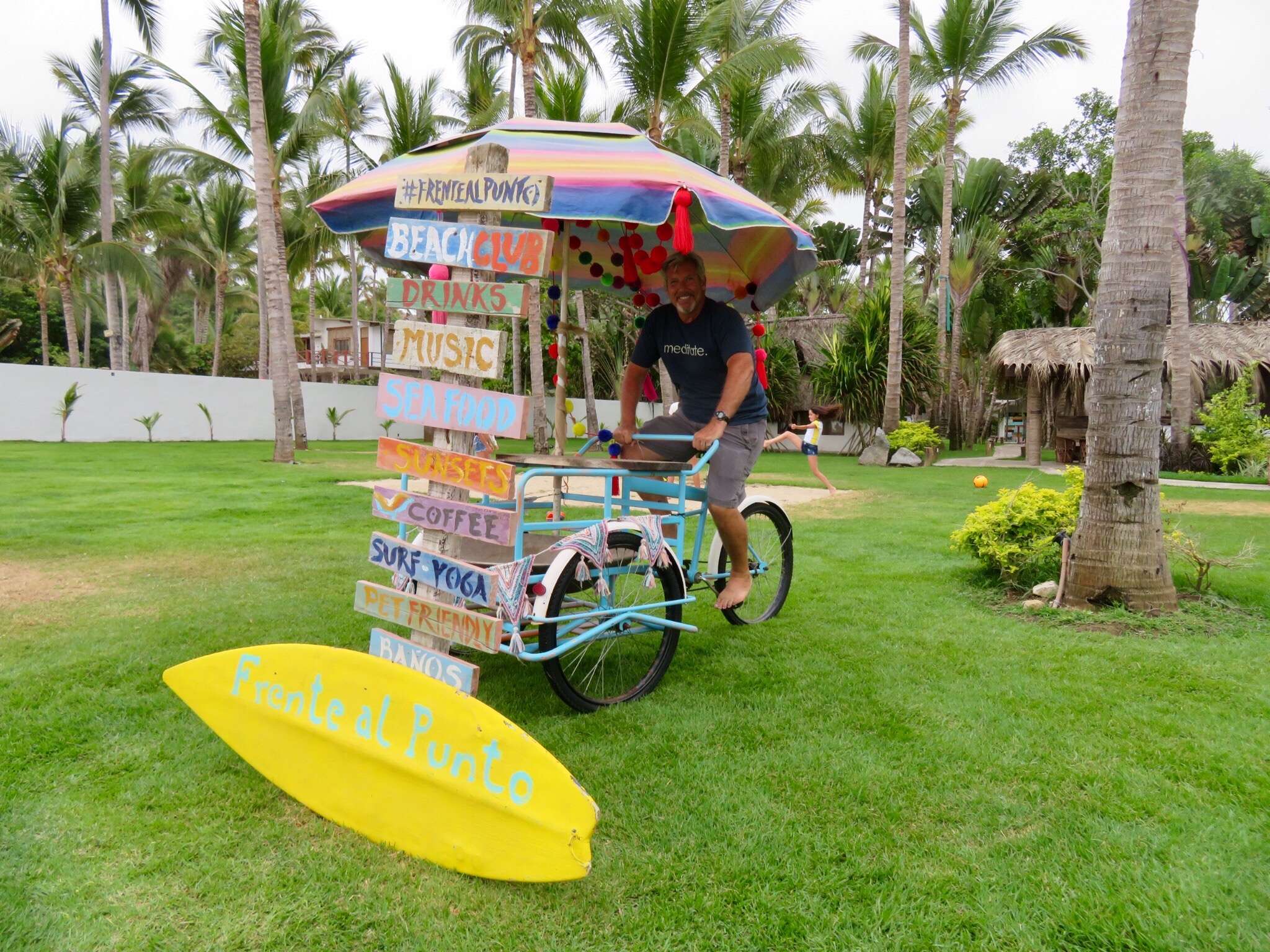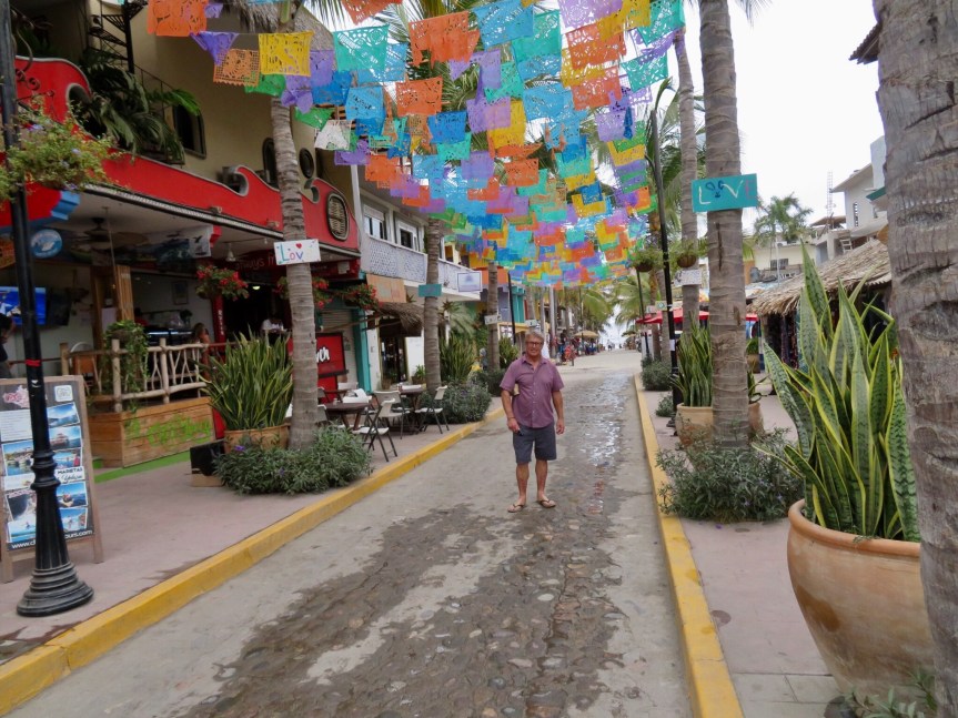 We strolled down the street to the town center then went back out onto the sand to take in the beach scene at the hub of activity in Sayulita. There were some gentle little waves with lots of people paddling around trying to catch them. The beach was littered with surf schools and board rentals with quite a few people taking advantage of their services. A lively colorful scene. Lots of hip young people congregating in this trendy little beach town.