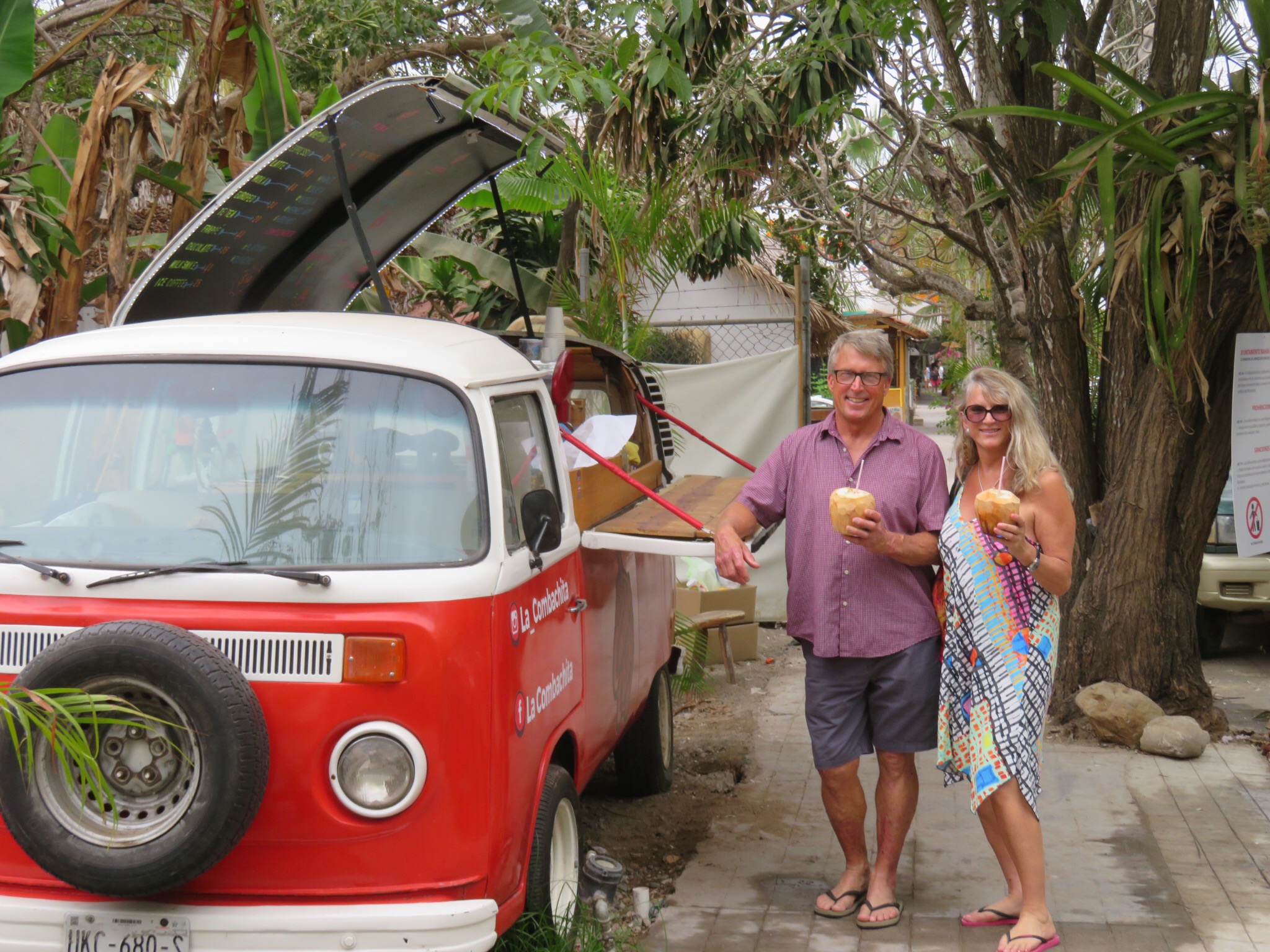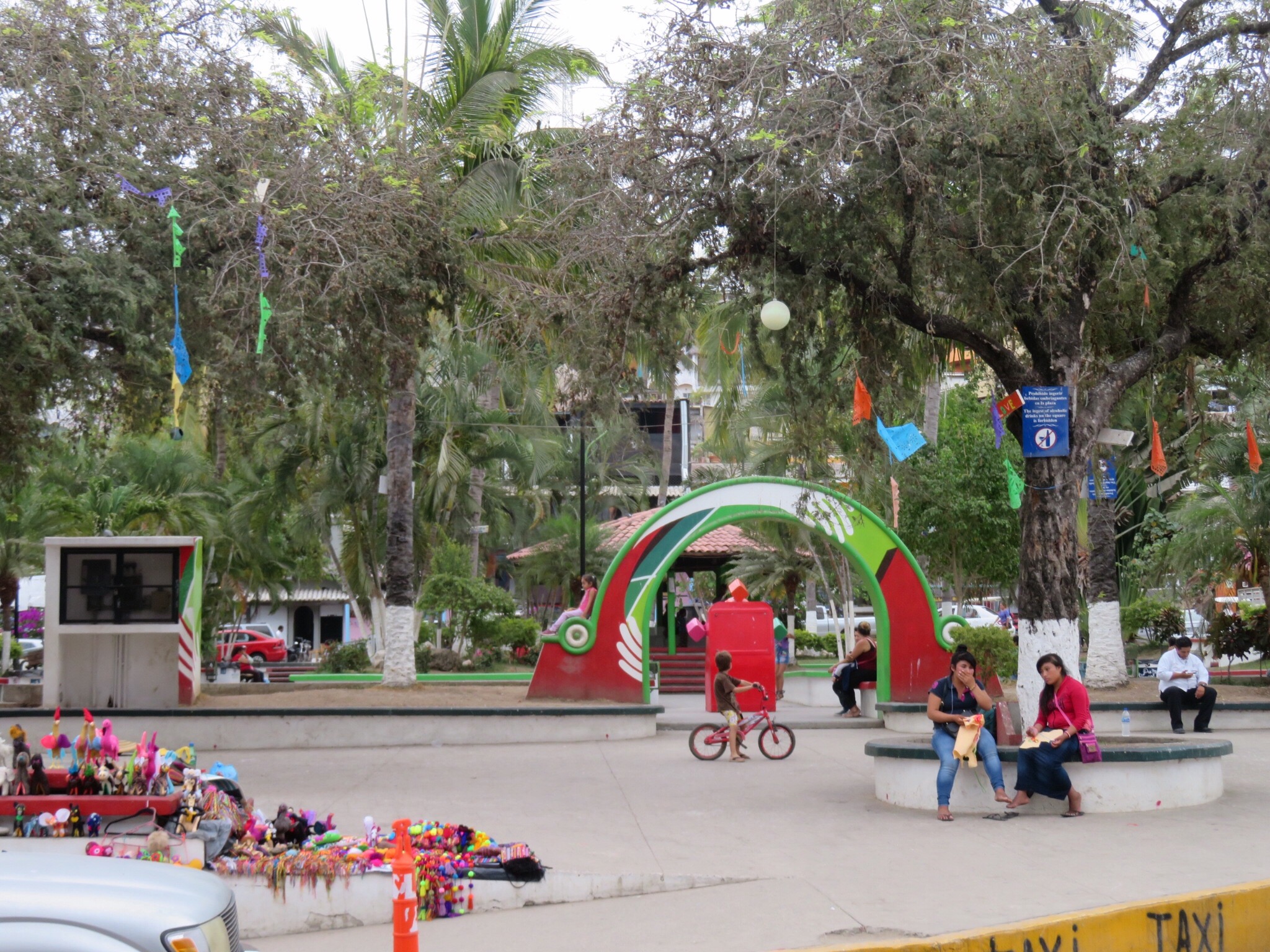 Interesting shops line the streets and we roamed the downtown area peeking into surf shops, spas and a hammock store. While waiting on a street corner near the zocalo, Shannon struck up a conversation with a local who distributes organic snacks. He opened a bag of beet root chips and passed them over to us. We tried to pay him, but he said no. Next thing we know, he’s ripped open a bag of corn churros and then a bag of chili potato chips. We had an impromptu sampling of his complete line of snacks. We thanked him and continued our meandering through the colorful, flag lined lanes.