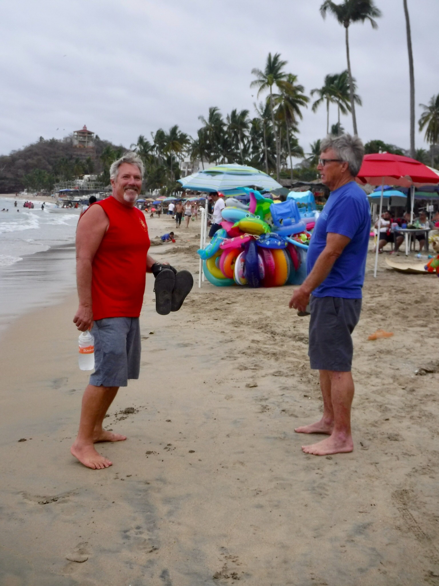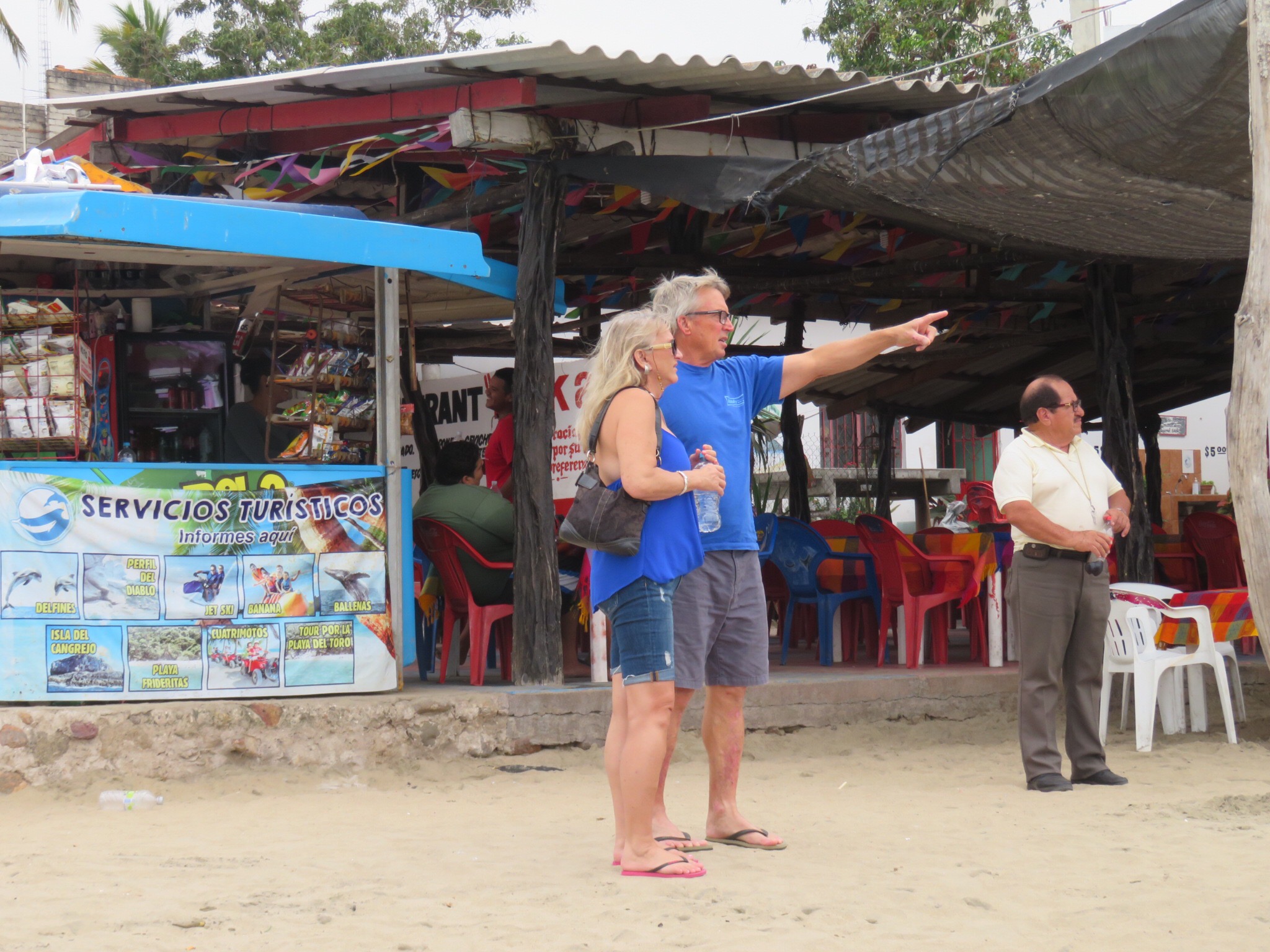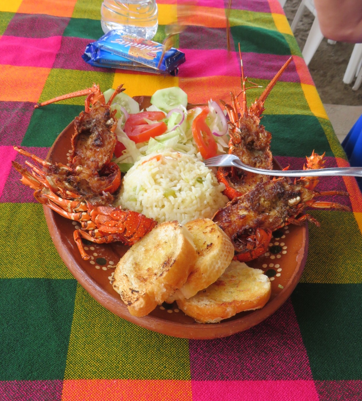 The bay was filled with boats and the water was full of swimmers. We were the only gringos in town as we meandered down the shore. The beach side restaurants were doing a brisk business and the crowd noise and children’s shouts gave the beach a carnival atmosphere. We walked to the south and Shannon picked out a restaurant a bit back from the water. We ordered up some seafood and enjoyed watching the families at play and a few partiers obviously overindulging. Shannon caught a local guy who might have had a few too many and kept him from keeling over backwards off of the high curb.