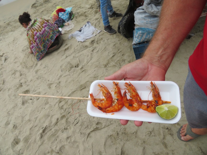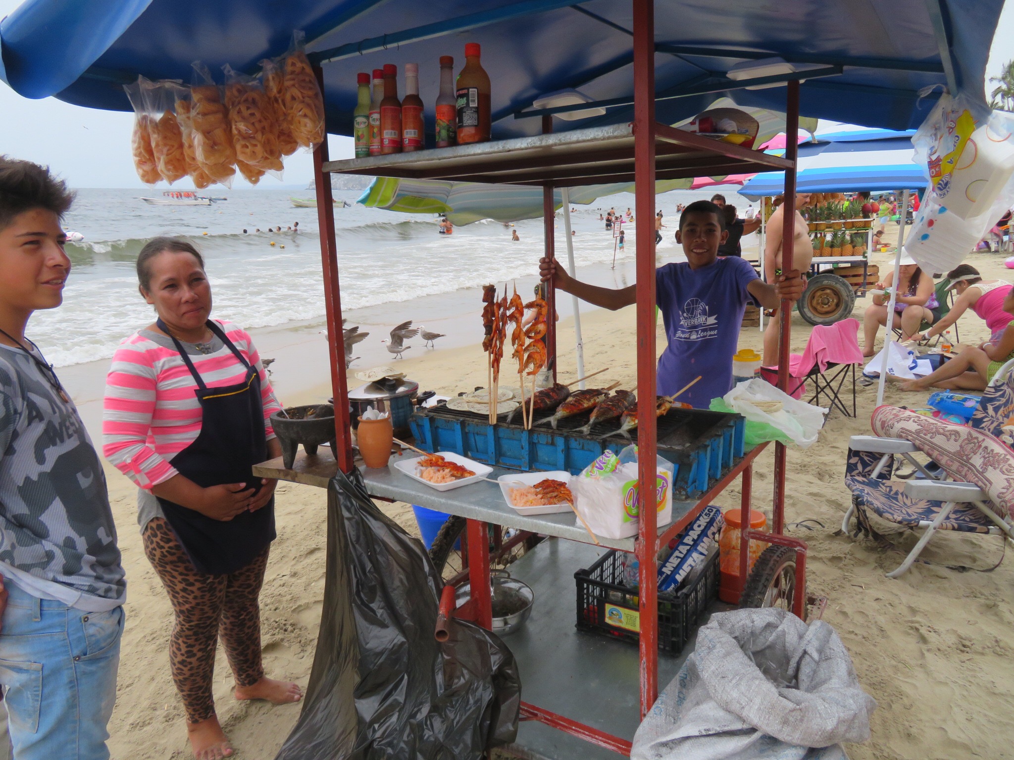 Being an overcast Tuesday, we had a mental image of Los Ayala being nearly empty and sedate, but as we pulled in next to the square, we noticed at least four large tourists buses parked up around the empty plaza. The beach was actually packed. We walked out to the beach towards the northern end where the tour boat had run aground on the sand. Tons of vendors were out hawking their wares. Fruit carts, fresh oysters, ceviche, shrimp on a stick, you name it, it could be had for a price on the beach at Los Ayala.
