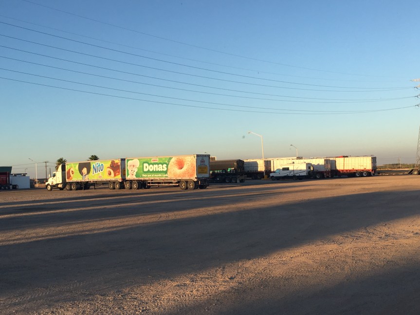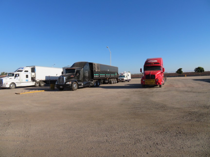 I spotted the Restaurant Elba at Km 192 and had to go a mile or so past to come to a u-turn to come back around. Gassed up at the Pemex then drove into the big dusty lot and hid myself behind a big truck. The girls and I took a tour around the compound sinking into the fluffy soft dust that is layered about an inch deep over the hard surface. Like powdered sugar. I talked to a couple of truckers who were polishing their rig. Totally tranquilo here they assure me. Not like the one up in Los Mochis. Which one, I don’t know, but if it’s not tranquilo, I’m glad I’m not there.