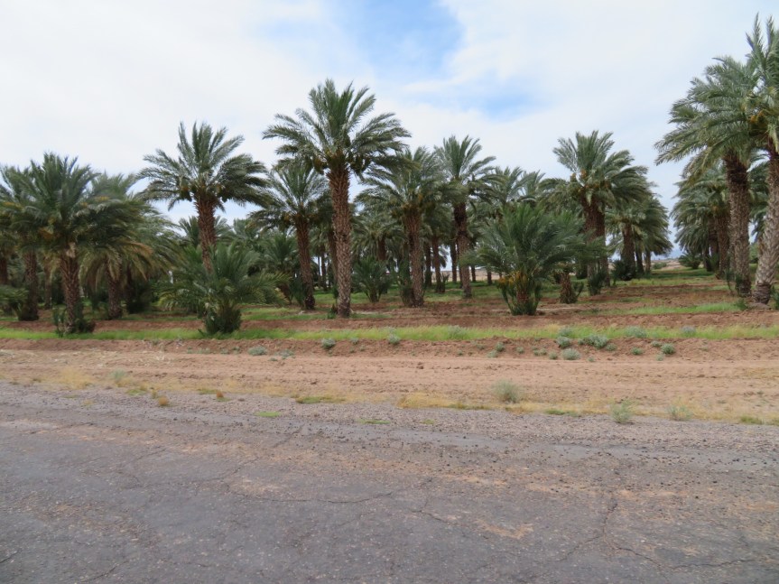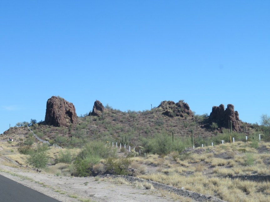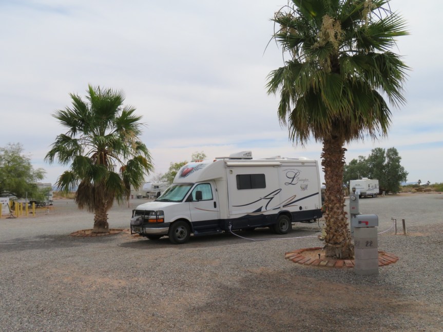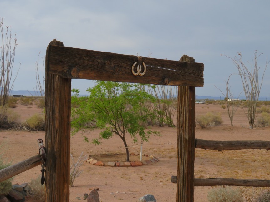 Pushed on for Gila Bend and some gringo style civilization, a Love’s truck stop and a McDonalds. Hate to admit it, but I had a cheeseburger. Don’t tell PJ, but Cali and Koda had cheeseburgers too. Gassed up, $97.50 and that at Arizona prices, 38 gallons with the gauge still showing a quarter. Set my sights on Yuma but the Monster energy drink I downed in Mexico wore off and when the wind kicked up after Gila Bend and I was white knuckling it trying to stay in my lane, I gave up and exited at Dateville. There was an RV park right there but it advertised full timers for $150.00 a month, I wasn’t sure it was a good idea.