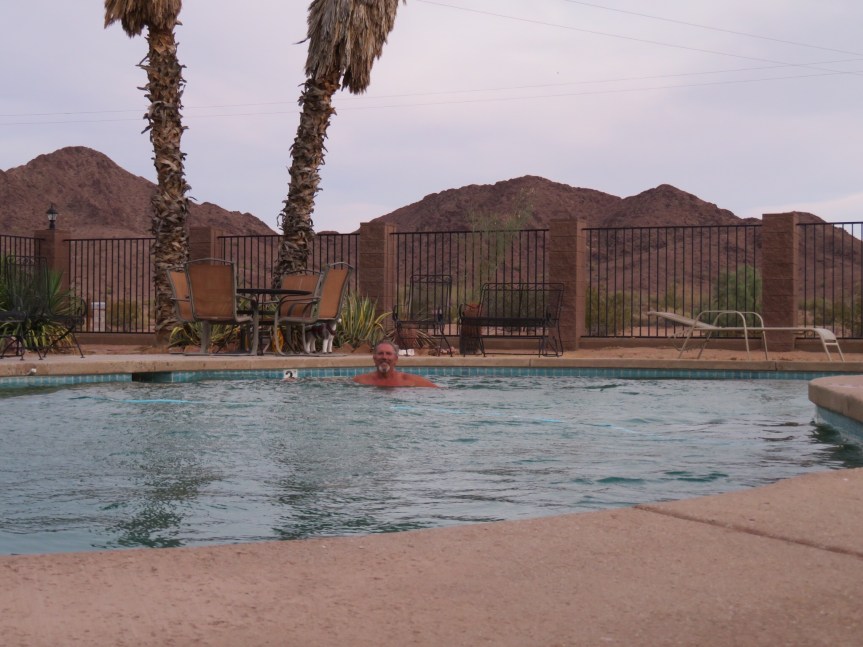 My T-mobile is useless in the US. As soon as PJ gets out here, I’m dumping them and going on Verizon with her. I had no data and a few wobbly bars of phone. I called PJ and she went online and found me a little out of the way campground just down the road and I drove on over to the Oasis RV park. Jim came buzzing over on his golf cart and got me set up in a spot near the pool. Another ghost camp. I’m the only guest in a good sized open to the desert getaway for snowbirds. Only the birds have all flown the coop.