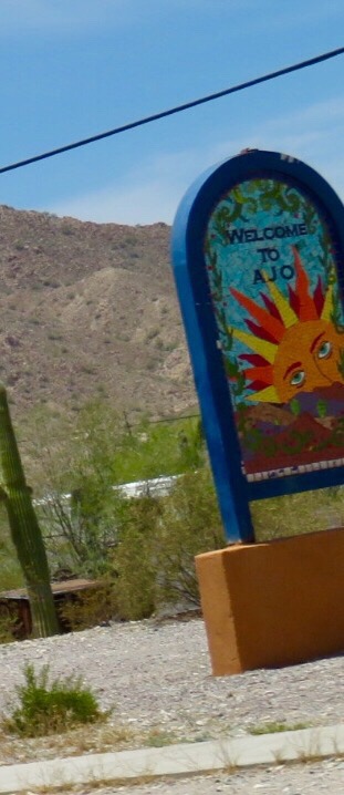 The road in Arizona was much like the road in Mexico, one lane each way with no shoulder. But the repair on the potholes was much better. Really smooth. Get the crew to give the Mexican team some lessons. Lots of empty country. I reached Ajo and felt like I was still in Mexico, maybe just move the border up a little to include it. When entering town there was a tope. The city was centered on big plaza surrounded by adobe looking buildings and a church. Then on the way out, there was a big roadside shrine to the virgin.