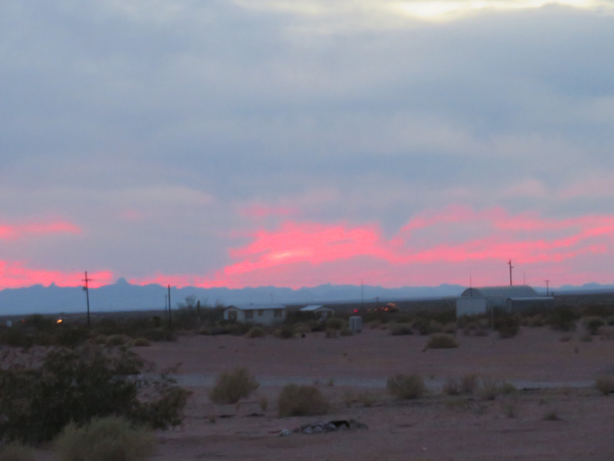 I laid down for a little while then cleared the stuff on the dinette side and filled the water tank. Then I organized a bit before exploring the area with the pooches. Ocotillo and sage. Jim keeps a clean camp. Nice graveled sites with little concrete patios with antique looking brick added. I went for a swim then cooked a few salchichas and sat in a beach chair on the patio enjoying the warm wind blowing across the desert. Jim came by around sunset and we talked for twenty minutes or so mostly about how a guy ends up owning an RV park out in the middle of nowhere. Pretty cool. Another outing for the girls then back into their mobile den for the night. Wind is dying quickly. Hoping for no wind tomorrow a.m.