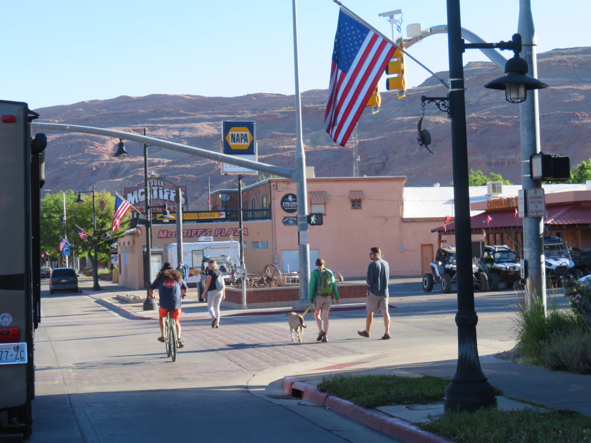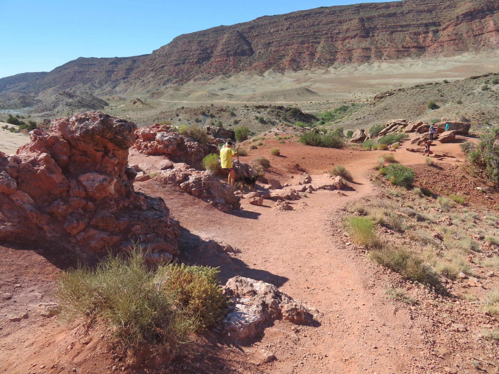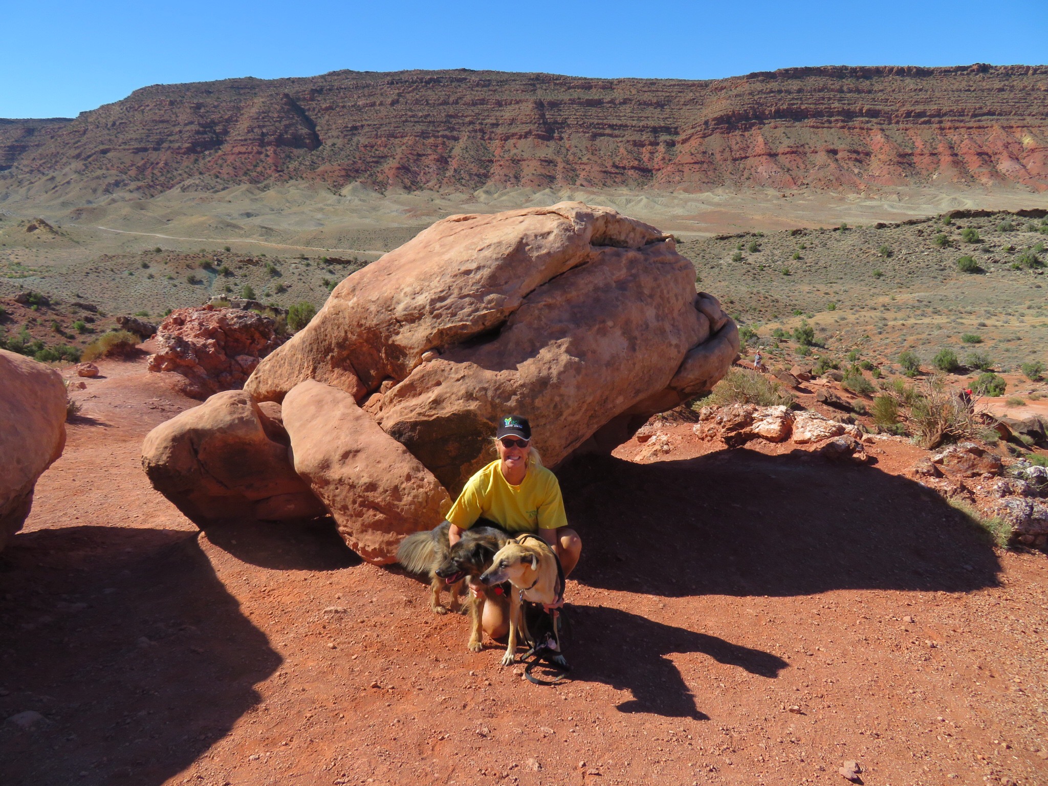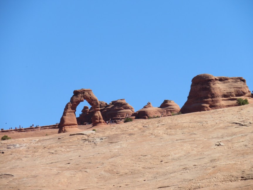 We drove the short distance to the end lot where a short hike would take you to a spot with a clear view of the arch although a bit off in the distance. We decided to break the rules and ignore the no pets on trail sign. We leashed up the girls and started up the path. A few hundred yards in, an oversized guy with an oversized family commented that I’d never make it up in flip flops then he turned to PJ and said ‘you know dogs aren’t allowed’. We continued on a few feet when Cali exploded in a huge puddle of chocolate milkshake on the side of the trail. The guy was aghast. I had to laugh as I was kicking dirt to bury it up. I wanted to tell the guy that if he was so interested in enforcing the rules, could he please go back to the trailhead and admonish all the cars in the RV lot for me.