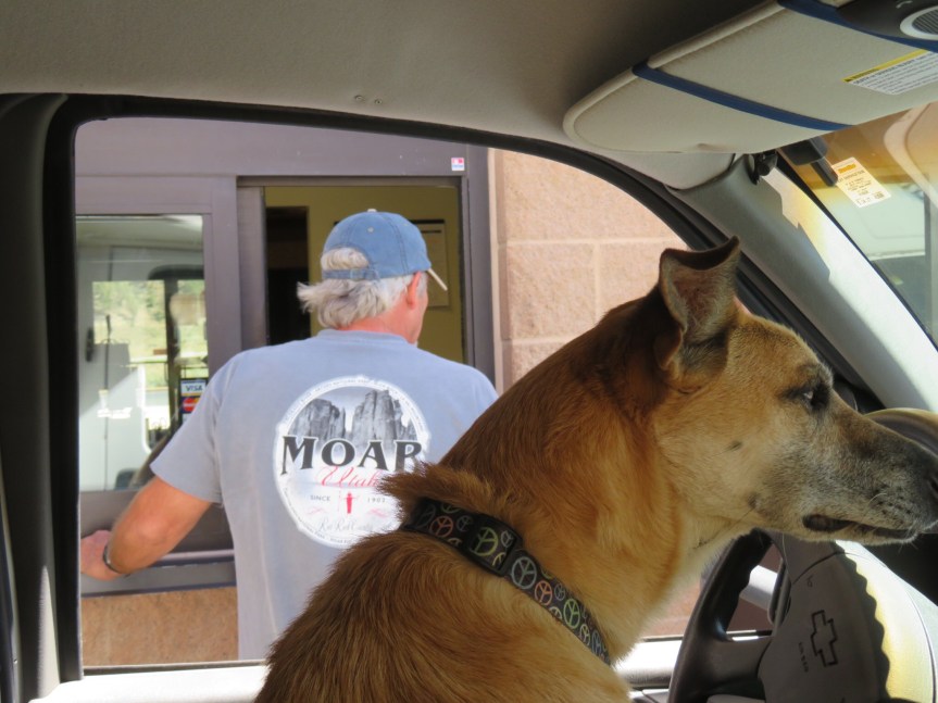 Once we were on highway 70, Cali started whining so we pulled to the shoulder and the poor beast was sick as a dog. I guess because she is a dog. Trucks were blasting by and it was an unsafe place to be. Back on the road, tempers flared and the rest of the day was tense and uncomfortable. Grueling drive with three unhappy faces staring forward and Koda obliviously snoozing in her little bed. Stopped for lunch and gassed up in Fruita, Colorado then kept calm and soldiered on.