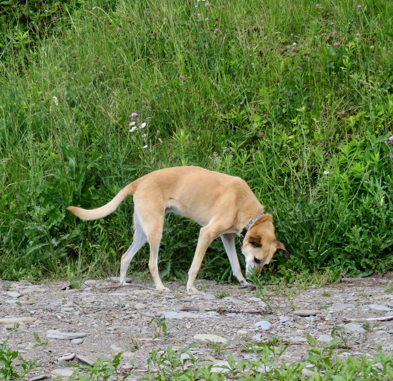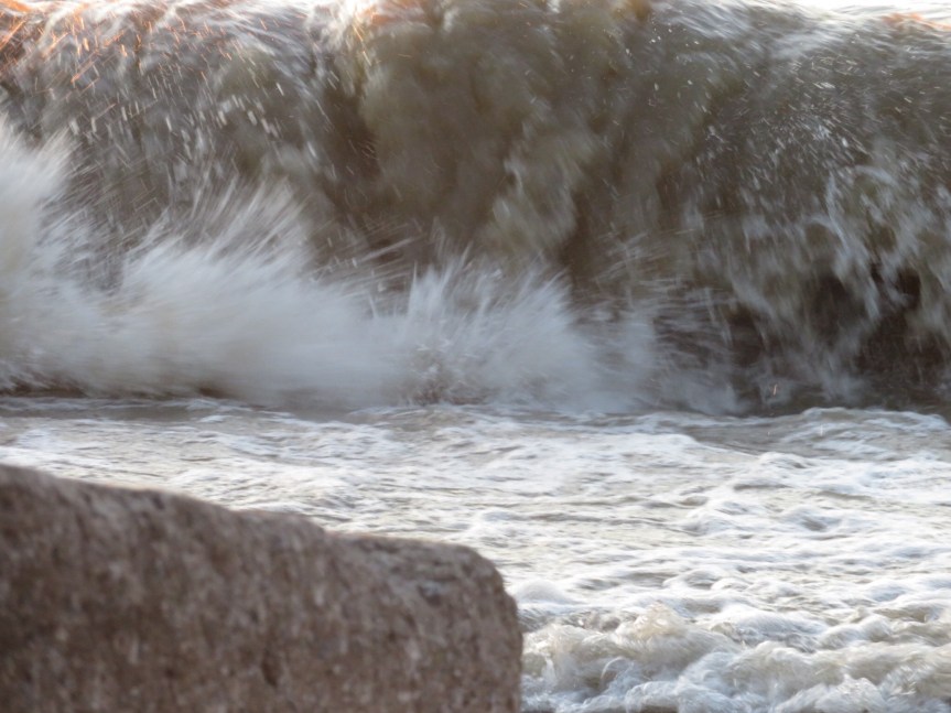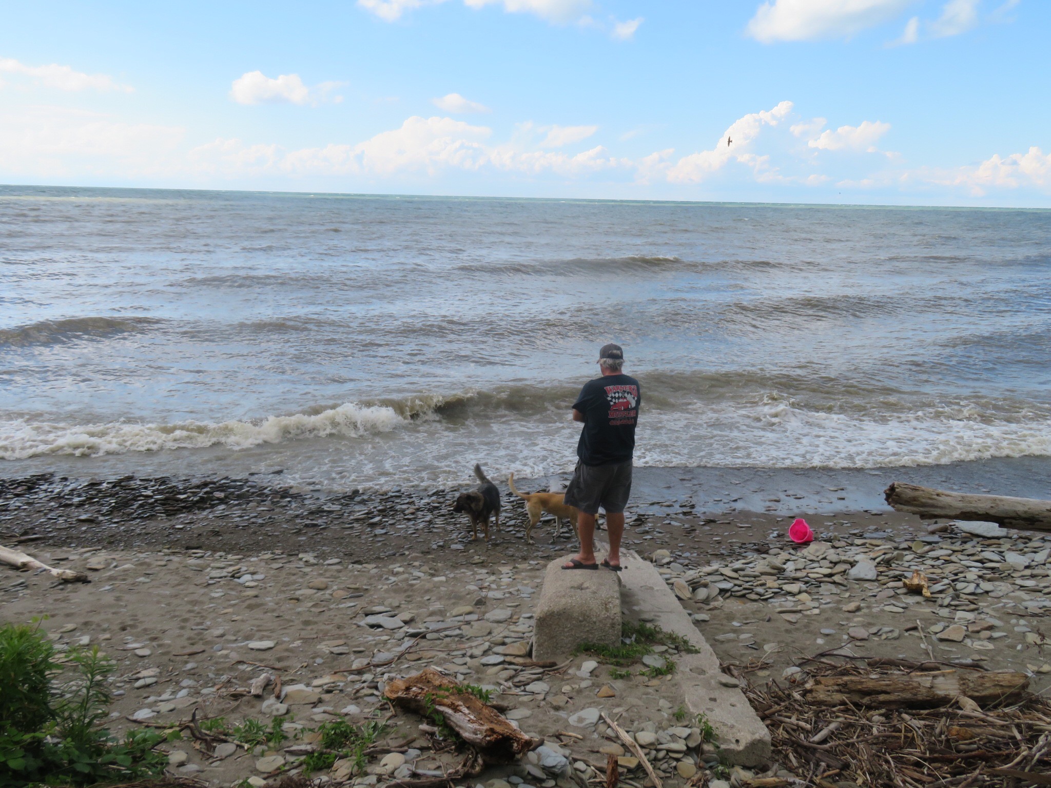 We walked the few yards down to Lake Erie where some 1 foot surf was rolling in to the shore. We let the dogs off leash and sat on a bench while they explored around the rocky beach. We are tired and cranky, so we just went back to the RV to rest and have a bite of dinner. I down loaded some photos, then rested my eyes and dozed a few times.