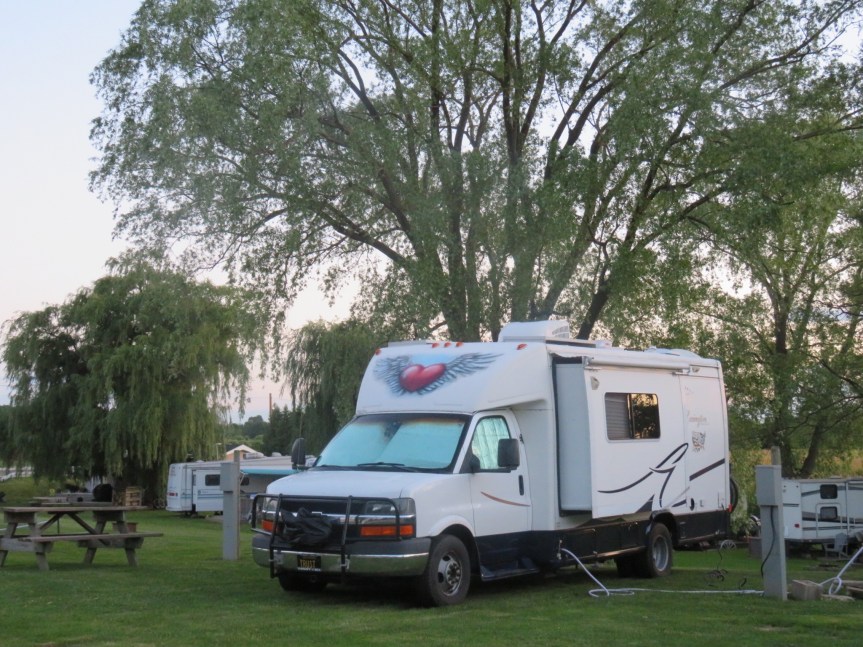 Rural back roads for the first seventy miles, then onto I-90 for the rest of the drive. Long drive. Hard wind, gusting 17mph through Pennsylvania and into New York. RV was pointing at an angle to go straight. Made multiple rest stops and near our campground we tried several exits trying to find a grocery store. Don’t people around here eat? In several of the little burgs, the small market couldn’t keep up with the declining population and went out of business. The quaint hamlet of Ripley was a cool side trip, but it’s been a long day and we just want to park up.