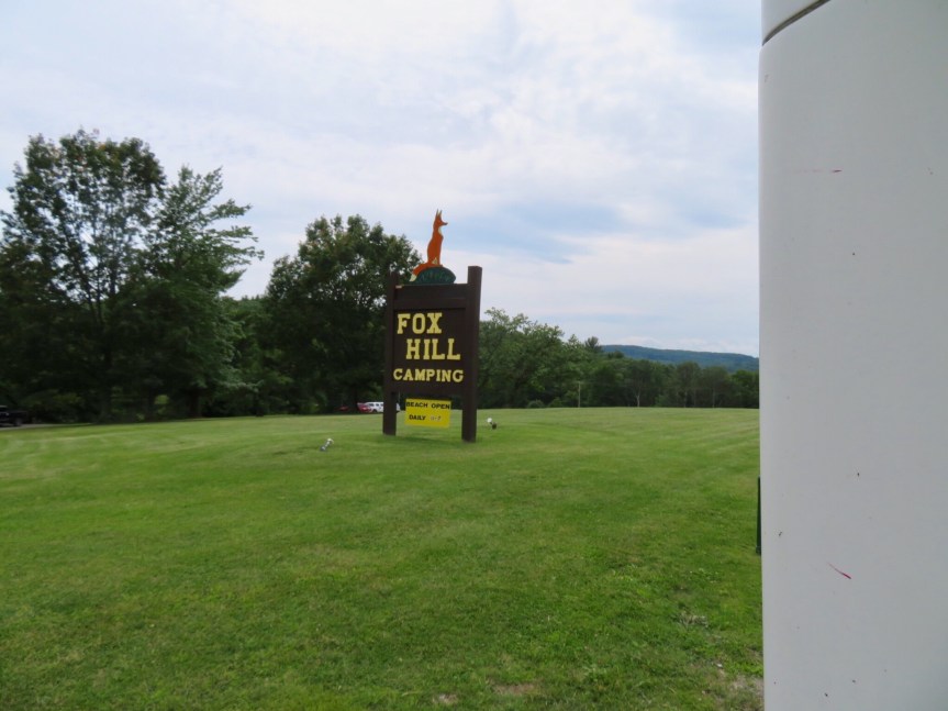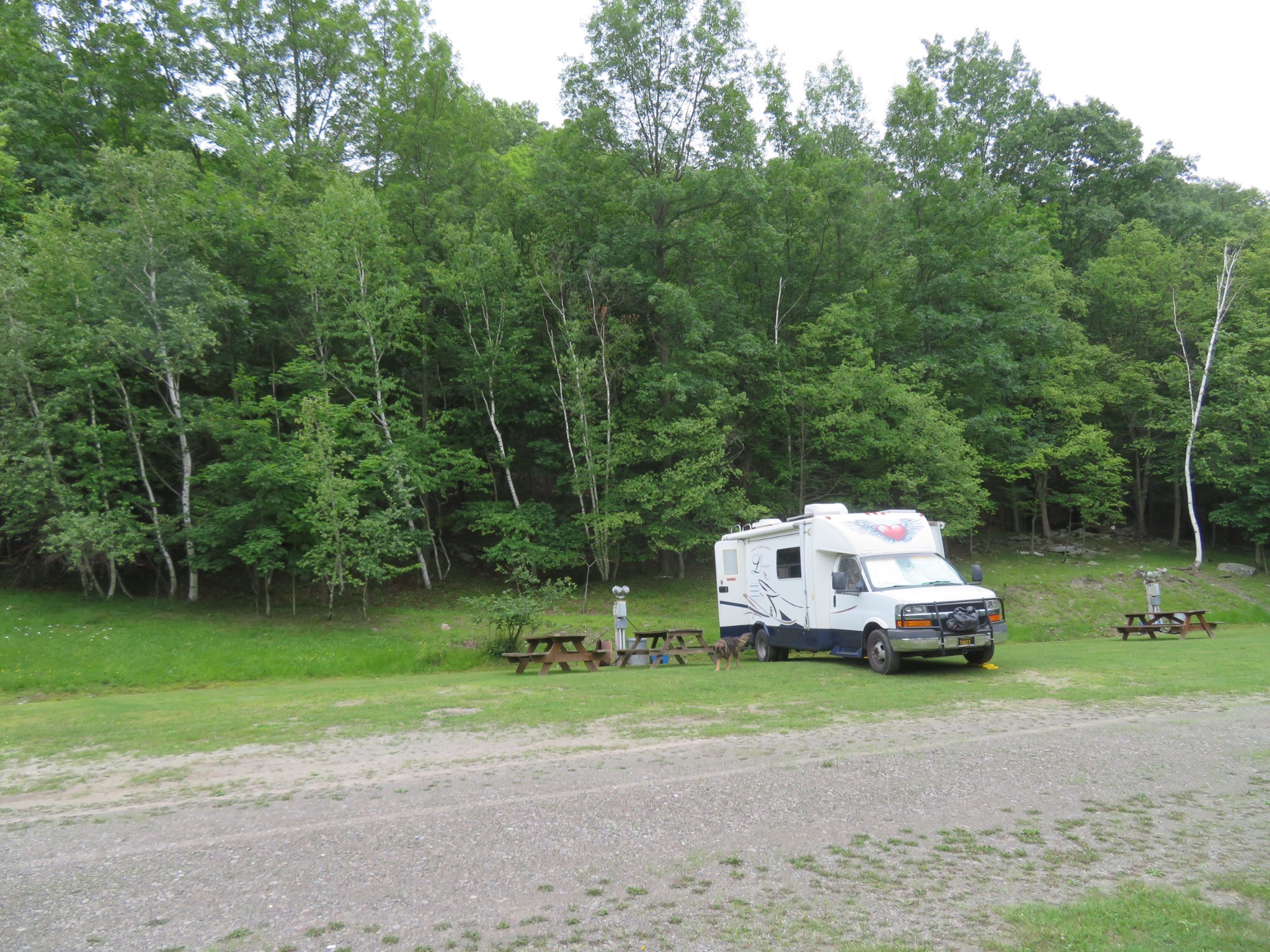 We stopped at a little market where the women were wearing the old school bonnets and putting together some great looking baked goods. Bought some water and a couple of lemon cupcakes. Drove on to the camp ground. The girl booked us in a site and when we drove past it to go to the dump station I noticed it was pretty unlevel, adjacent to the playground and near a lot of other people. We drove up the hill to clear out the tank after doing our ice thing. Poor dump station, a hole in the ground, no more. The nearest water tap was about 40 feet away on the side of the bath house. I only have 20 feet of hose, so we used some gallon water jugs to haul water and rinse.