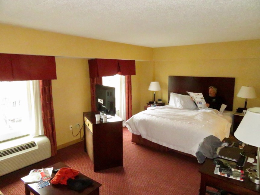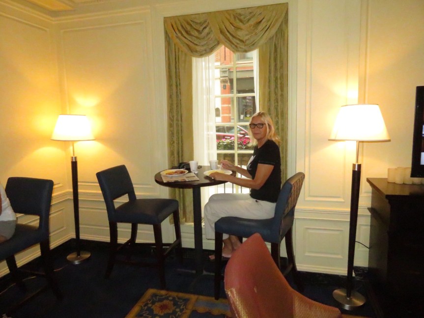 We managed to get ourselves out of the cozy confines of the plush king sized bed barely in time to get our complimentary breakfast before the management put it away. We sat in a quiet alcove, well quiet except for the super loud lady with the Fran Drescher accent, and enjoyed some mediocre cafeteria fare.