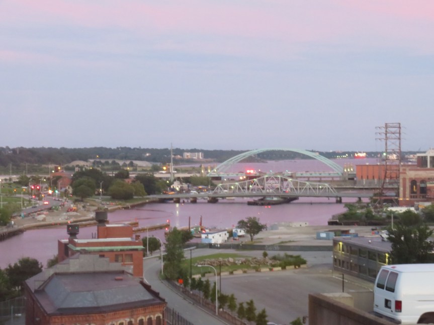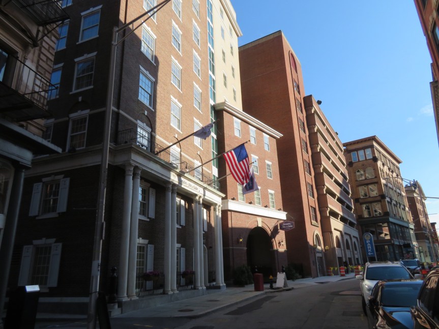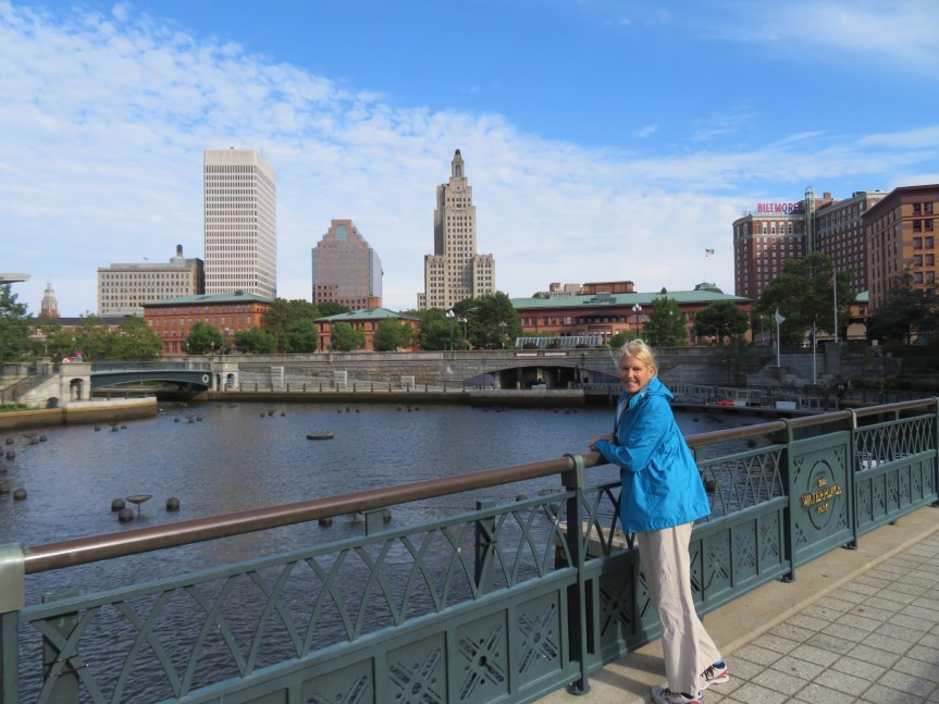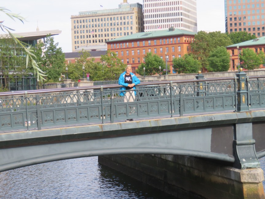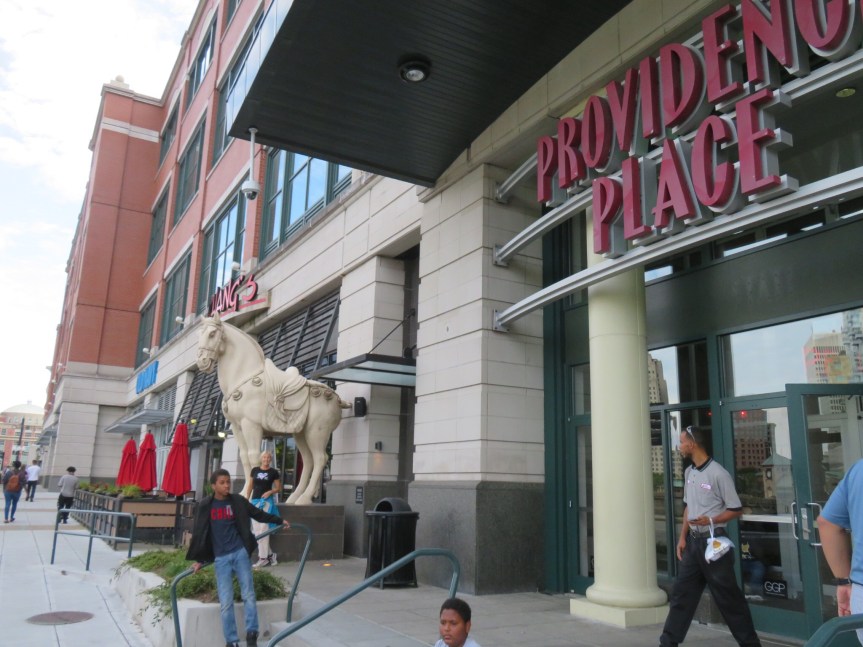 PJ really wanted to take a pass through the Providence Place mall, so we took our lives into our hands and ran across the traffic burdened streets and entered the mall by the large horse statues. The mall is more a vertical mall than a horizontal mall. Escalators go up around 6 floors spreading the shopping around on multiple floors. We rode to the top, had a look around and then exited back onto the streets by the canal.