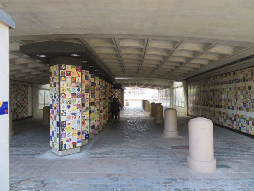 The air was fresh and the sky was threatening rain as we strolled along the river walk. A small tour boat was shuttling tourists around as the gondolas sat forlornly along the bank waiting for potential customers. There was a large underpass with hand painted tiles that were set into the walls as a memorial after 911. A small crowd was milling about reading the sentiments and reflecting on the words.