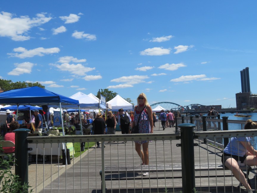 We arranged for a late check out then went back up to the room to hang out in the peaceful suite. I did some writing and we read the Sunday paper sitting on the little divan. As two o’clock approached, we packed up our bags and took them down to the front desk and had the clerk store them for us while we walked across the river to check out the sidewalk market, the flea.