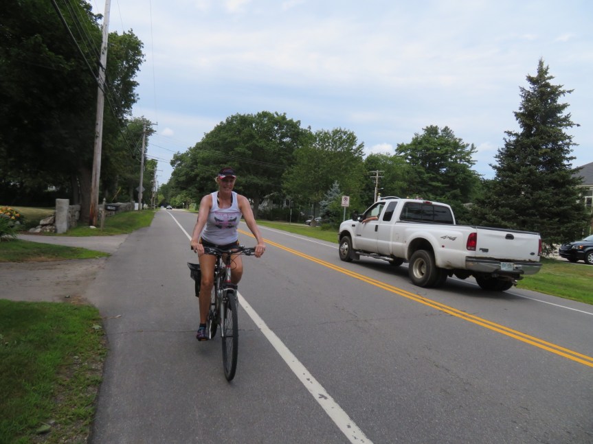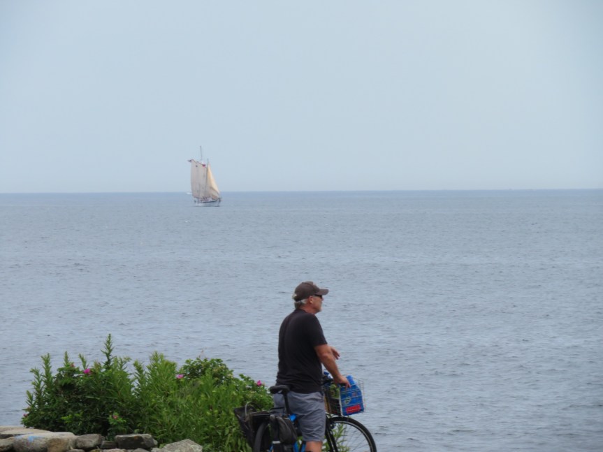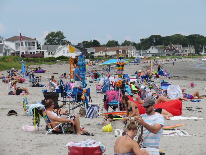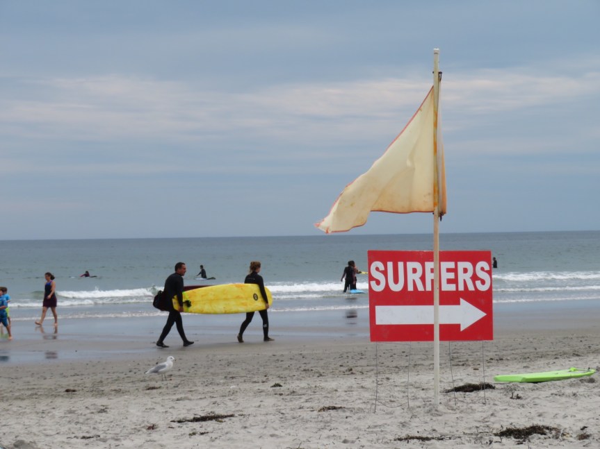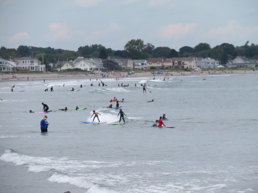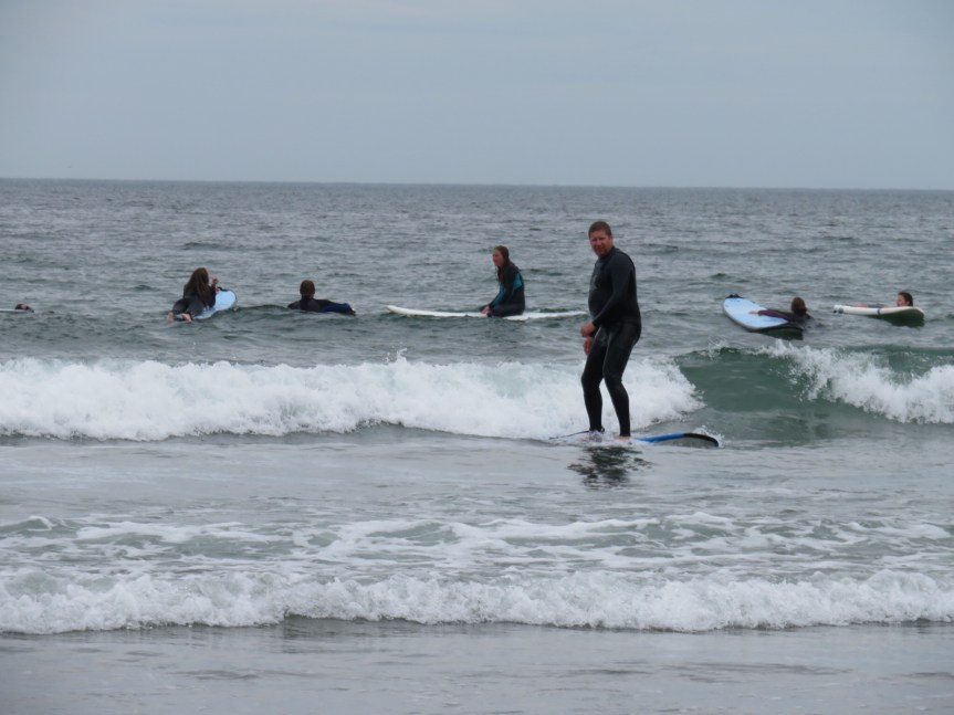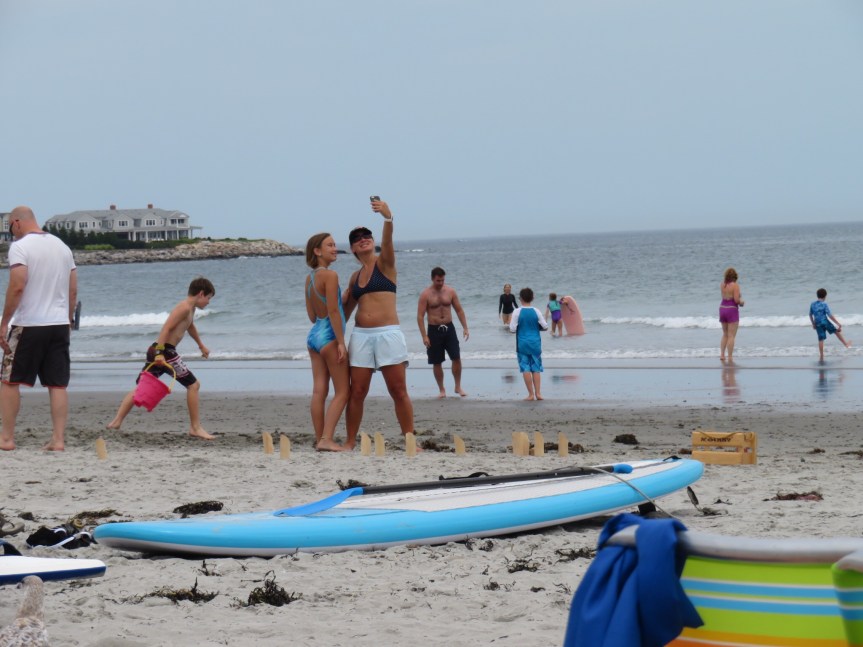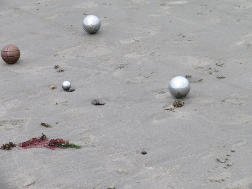 We rode on over to the main beach and claimed a few square feet of sand. Little Quebec here in Rye. As much French as English is being spoken on the beach today, same as at the campground. A pretty decent crowd for a weekday mostly out of towners I’m guessing. A pair of old Quebeckers were playing bocche ball and really enjoying themselves. Kids were running in and out of the water and the number of would be surfers was huge.