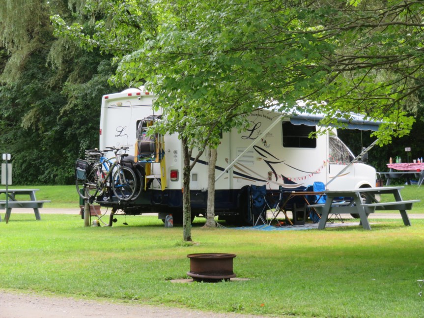 A few more miles out into the boonies brought us to our campground for the night, Sandy Pines. We checked in, found our spot and leveled everything up. A nice spot in the shade of some trees. We are the end space and backed up onto the woods, so the only neighbors are across in front of us.