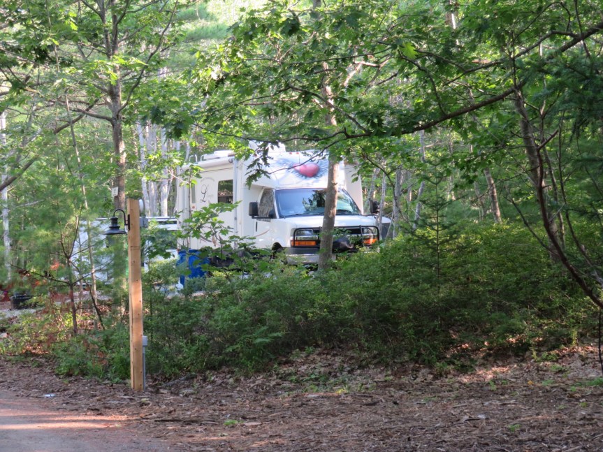We toured the camp, lots of trees with sites strategically hidden among the bush. Near the office, there are a large number of ‘park model’ mobile homes that folks can rent or purchase. The pool looked nice, but it was infested with squealing kids. We thought about making the one mile walk down to the nearest beach, but Koda was looking tired and it was getting late so we opted to lounge around in our folding chairs and enjoy the quiet.