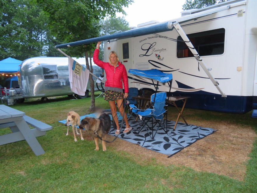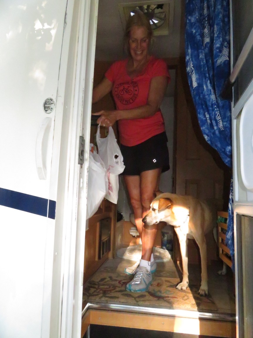 Sunday morning, were up early again with Cali walking her around the campground. She is still not eating very much and consequently has trouble going to the bathroom. We got a little more sleep, then sat outside drinking tea and having a leisurely breakfast. Quite a few of the neighbors were packing it up and heading out. Nice for us.