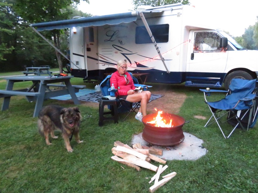 We let the hounds out for a walk, ate some dinner then bought a load of firewood from Frank, the older guy on the utility cart that circles around the campground selling logs to all the happy campers. We had a nice fire and watched as the full moon emerged behind the large stand of trees that line the tent sites.