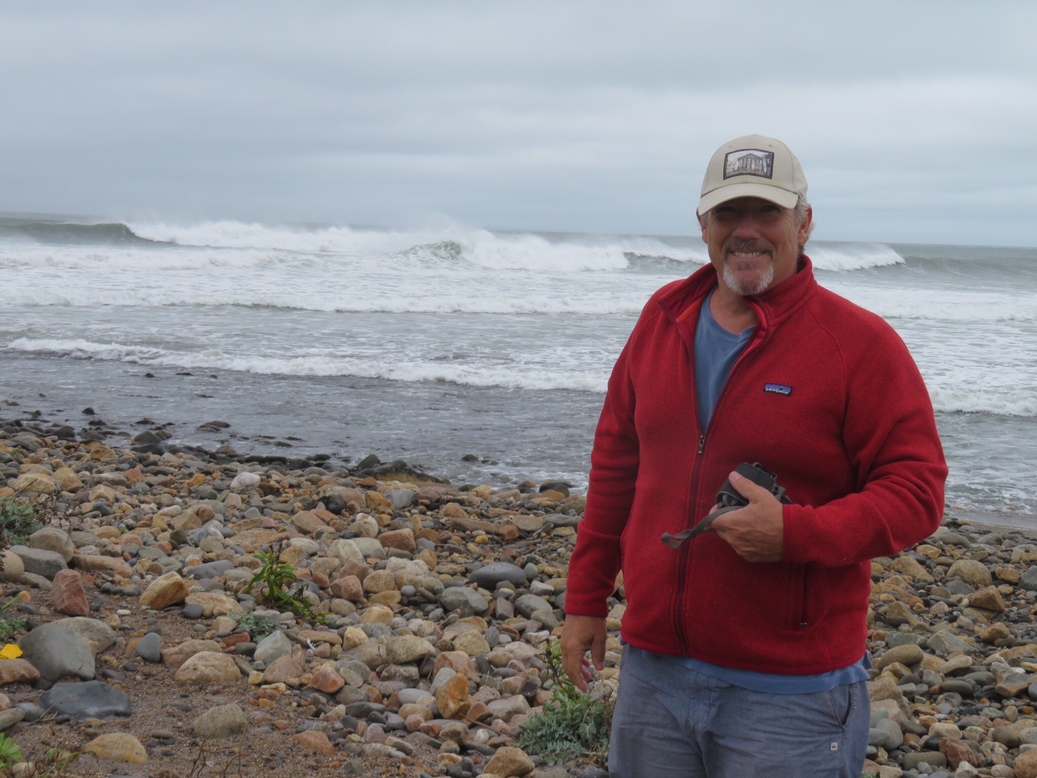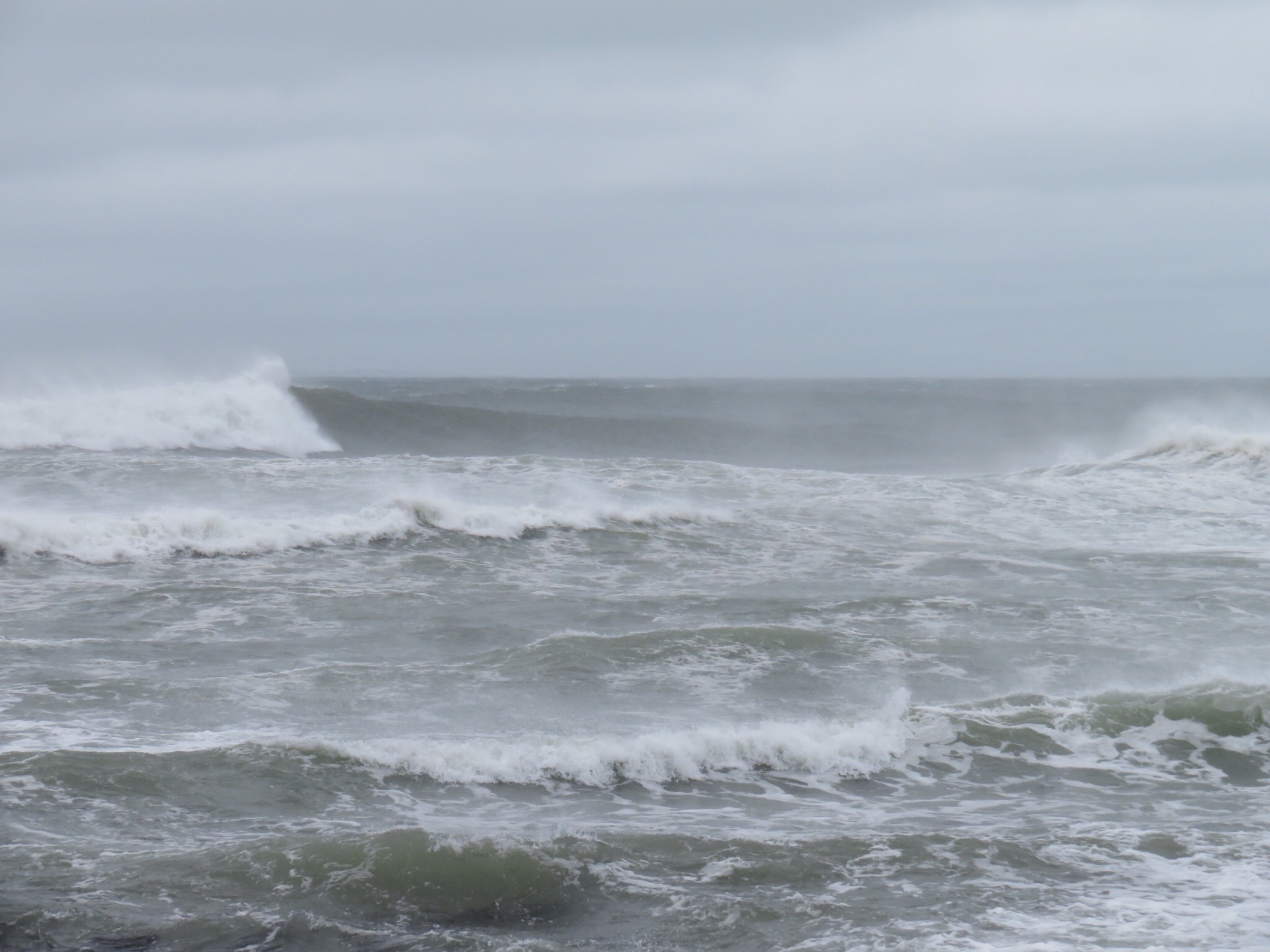 PJ and I sloshed through the muddy trail that follows along the blown over reeds surrounding the chain link fence that goes around the lighthouse. We emerged on a rocky stretch of shore and got a front row view of the large swells rolling onto shore.
