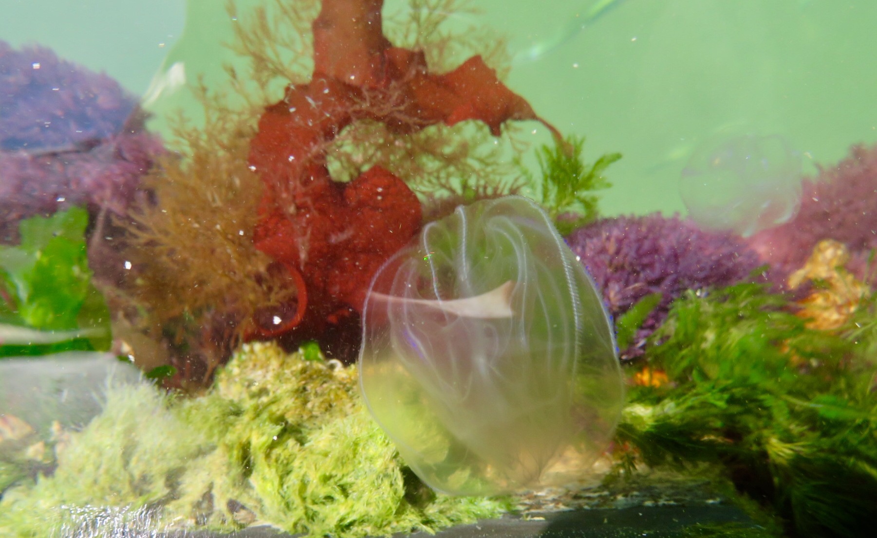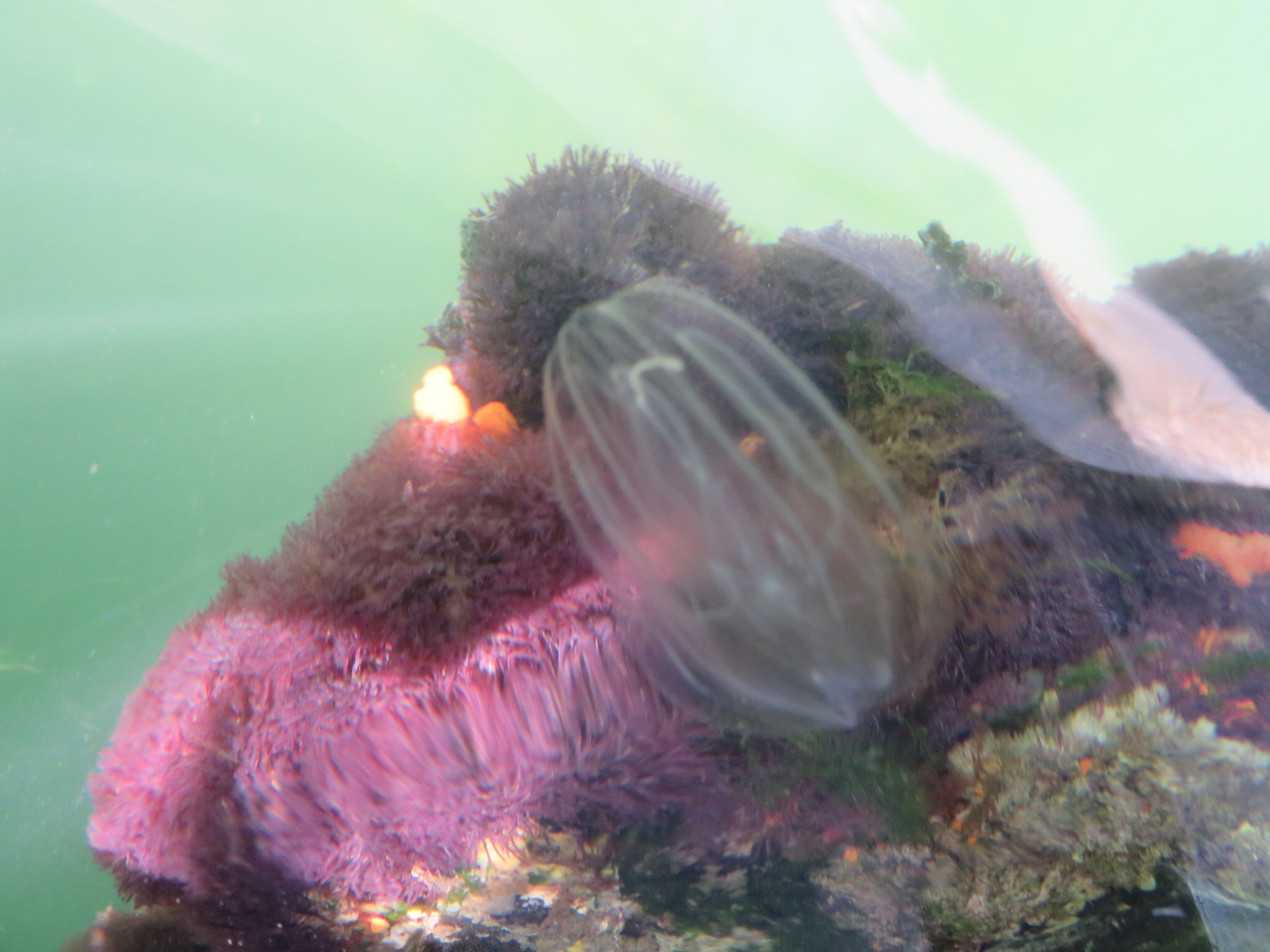 In the afternoon, we had some free time, so PJ and I walked over to the docks and watched some sail boats racing in the sound then we got down on the docks and checked out the invertebrates attaching themselves to the mooring. Lots of colorful sponges, sea squirts and algae. But the coolest thing we saw was a bloom of ctenophores that were floating along the surface with the current running by the dock. They were flashing colors, electric blues and oranges.