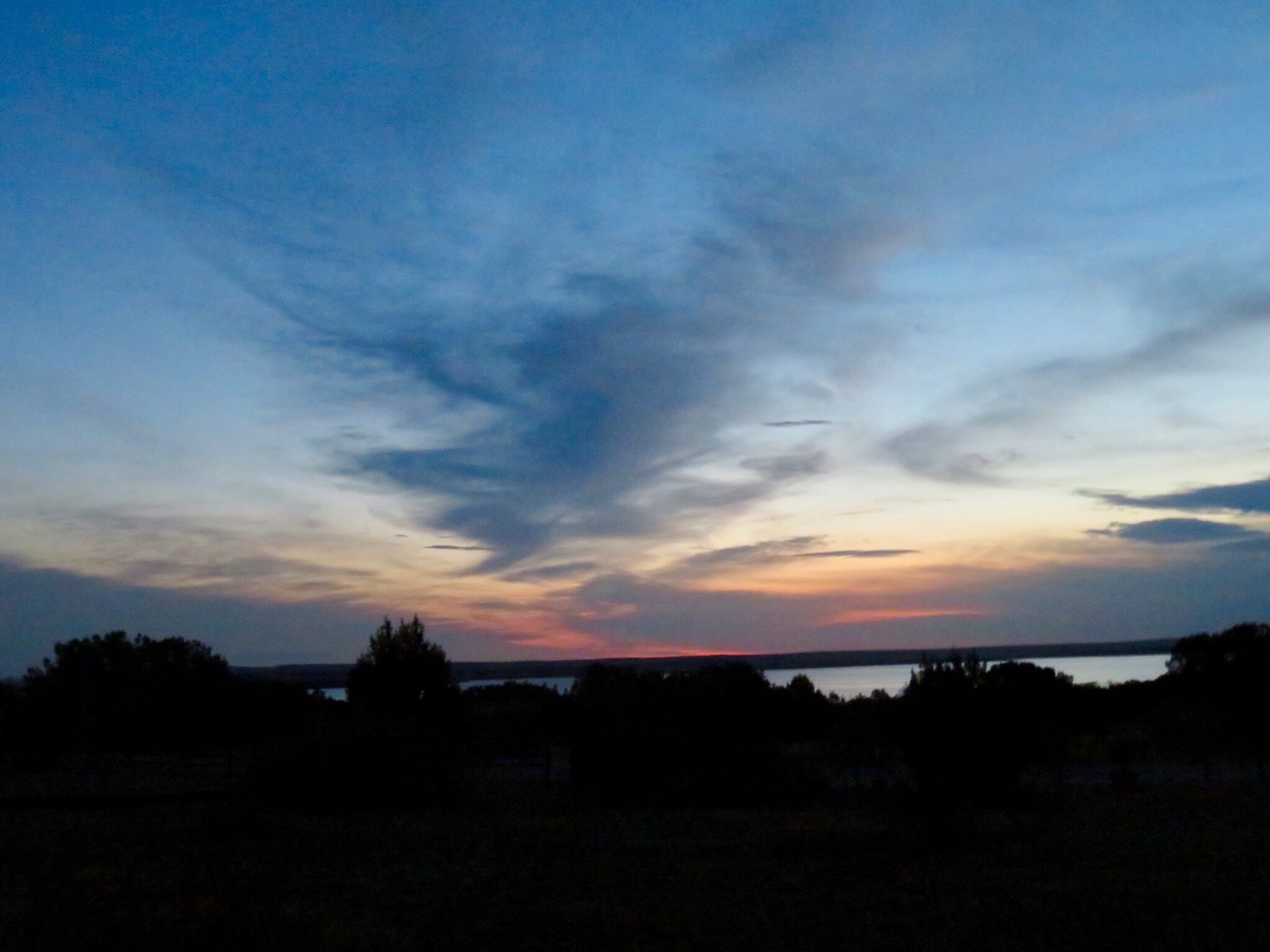 Cali was fidgeting and demanding attention in the pre-dawn hours. PJ took her out to see if she needed to go to the bathroom and the activity soon had everyone awake. I boiled up a mug of tea and went out to catch the sun coming up over the lake. It was slow coming and the air was a chilly 40 degrees. The sun soon made its appearance along with some deer and flocks of birds getting an early start on their day.