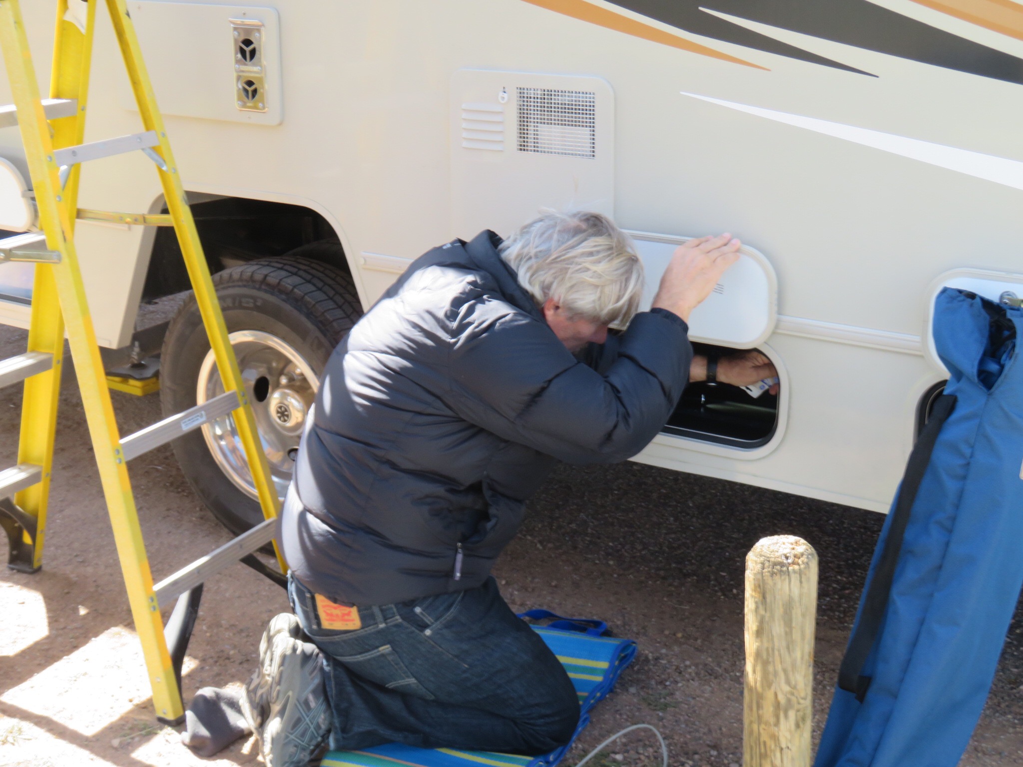 While I had the silicone out, I decided to go ahead and try caulking the seams of one of the storage compartments that was leaking and see if that might seal out the water that was coming in. I got out my Buc-ees beach mat that we picked up in Texas last year, and got down on the ground and reached in and ran a bead of silicone along every joint in the bay. Hopefully that will solve the leak problem.