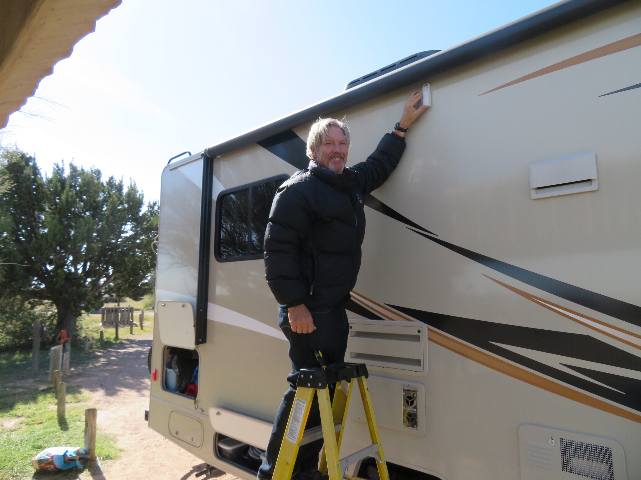 I did a couple of small projects I had been wanting to take care of. I dug my drill out of the back storage area and installed the outside temperature sensor on the side of the RV up under the awning on the passenger side. A small screw, a strip of 3M vhb mounting tape and a bead of silicone to finish it off. I had placed the sensor in an outside storage compartment but it wasn’t really an accurate estimation of the outside temperature. This should do the trick.