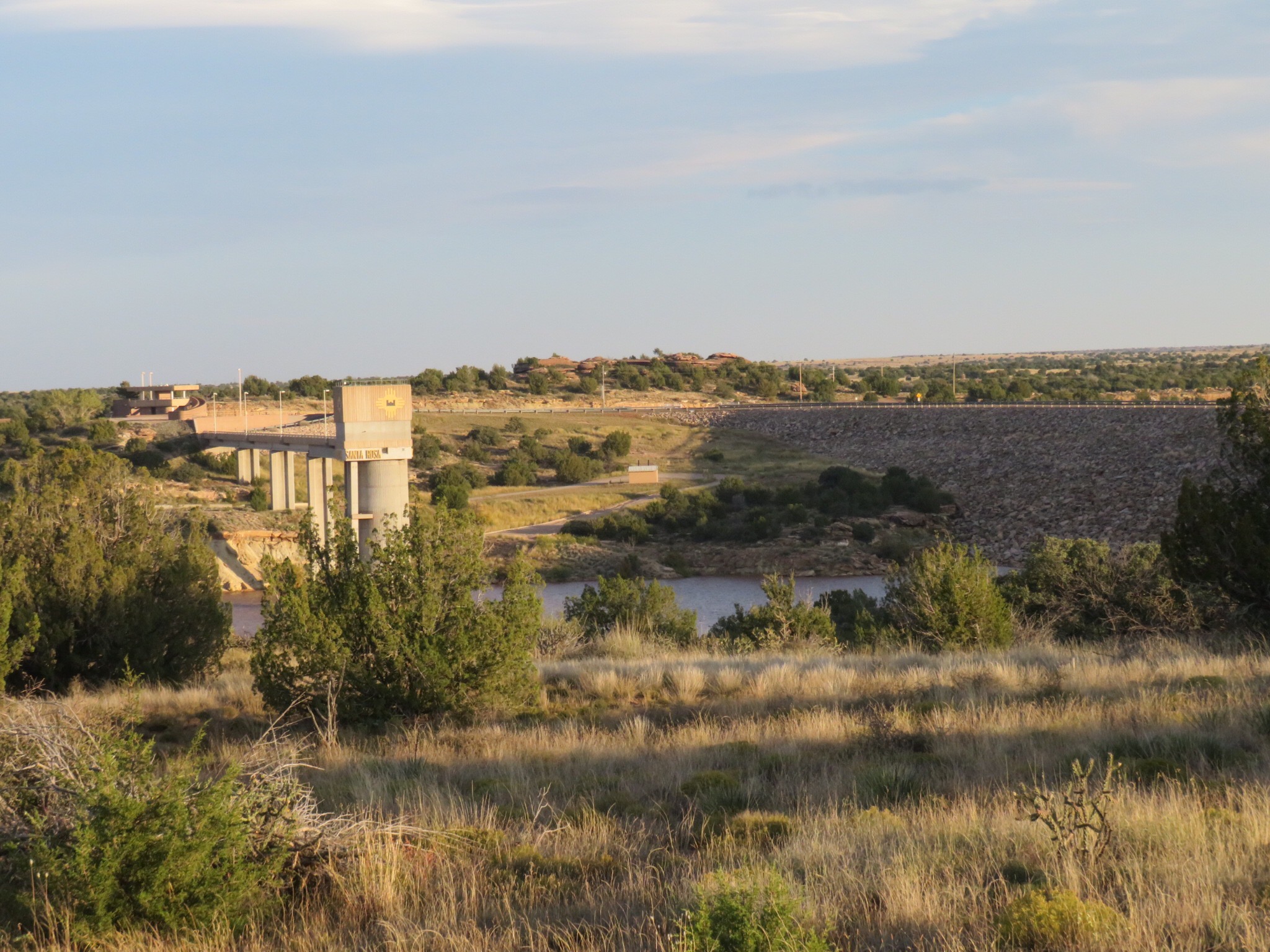 As the evening approached, weary travelers started pouring in looking for a safe haven for the night. Trailers, big diesel coaches, camper vans and even some tent campers. The small tear drop style trailers seem more popular than ever. We took the dogs for a long sunset stroll up the main road out towards the dam. Cali wasn’t digging the wind and we turned back after reaching the top of the hill overlooking the rocky levee that holds back the Pecos River creating Santa Rosa Lake.