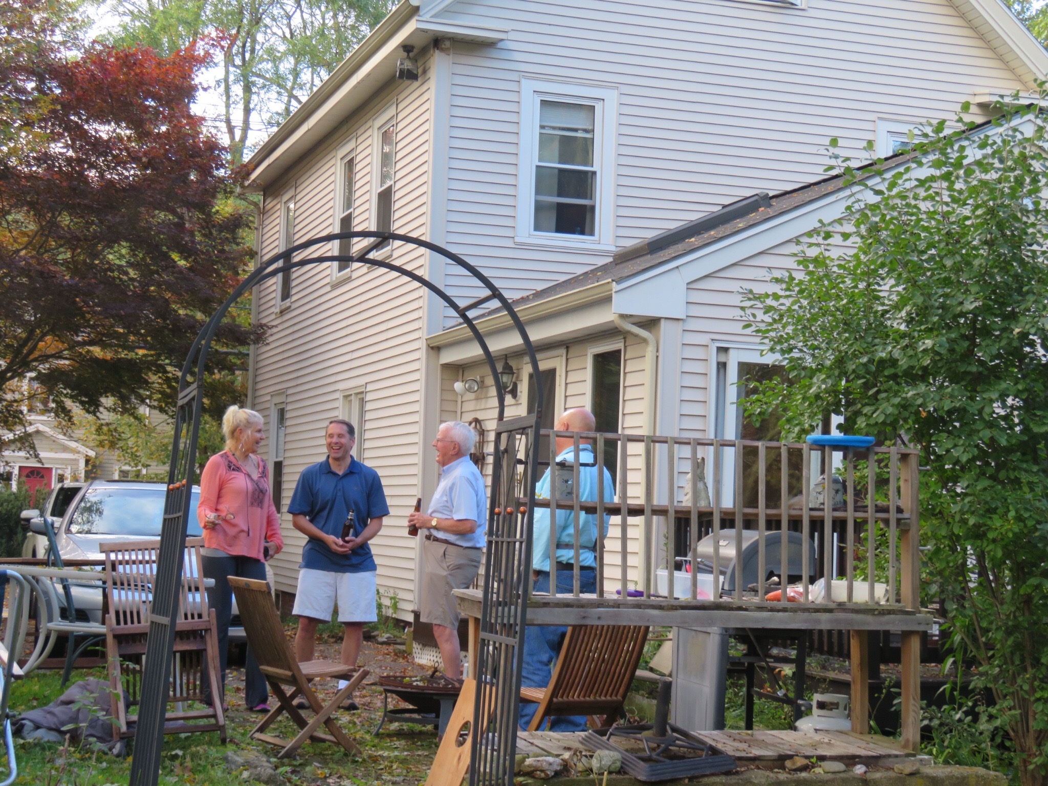 We took a wet ride through Providence braving the pouring rain to head up the freeway to Georgetown MA. Aunt Norma was celebrating her birthday (can’t tell you how many) at cousin Beth’s charming country home in northern Mass. Norma was taken completely by surprise when we pulled up. Cousins Holly and Chris were already there creating gourmet dishes to serve up for the party. Beth’s son Camden was home from college for the get together along with a couple of old family friends. I staked a spot out near the bar-b-que along with Uncle Clayton and Chris.