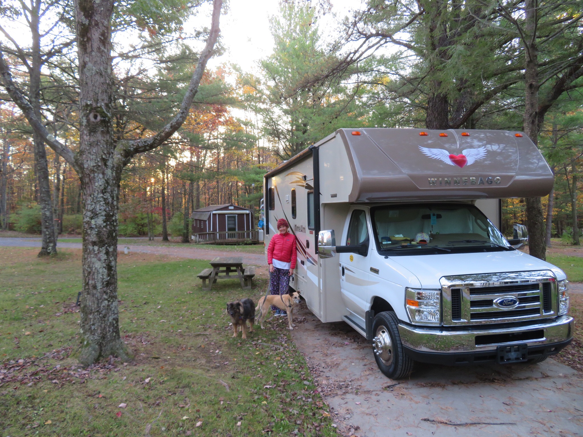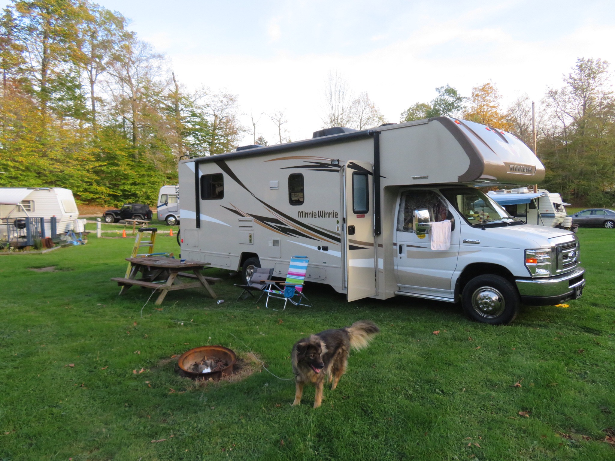 As we got into Ohio, the landscape grew more crowded and the trees gave way to industrial enterprises. Three lane toll roads replaced the forested two lane highway we were becoming accustomed to. After negotiating a maze of construction near Streetsboro, we eventually reached our exit and made our way down to Woodside Lake. The place is surprisingly full for end of October. Lots of families and long term campers. We were given a site down in the lower meadow next to a couple of guys from Michigan tent camping for the weekend.