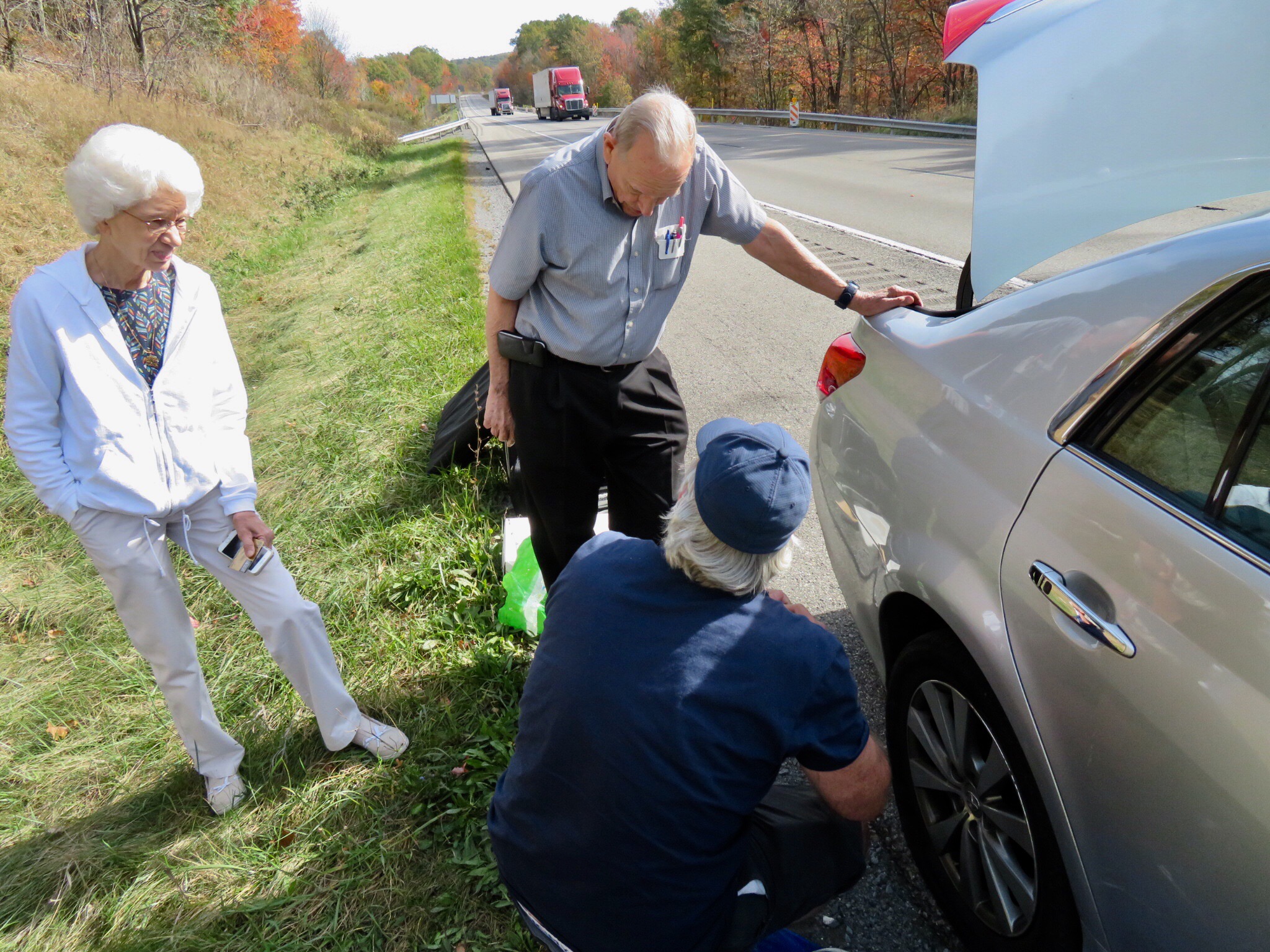 We accelerated up the ramp onto highway 80 and settled in for a long straight day of driving. Set the cruise control at 65 and sat back and relaxed. About an hour into the trek, we passed an elderly couple stranded on the side of the highway. I pulled onto the shoulder and backed up as far as I could. A missionary preacher named Art from New Jersey with his wife Peggy. They had a right rear flat tire and he had it serviced at a garage in Jersey where they cranked the lug nuts on so tight that he couldn’t get them off. I got the breaker bar out of my basement and we got most of them loosened up but when it came to the locking lug nut, the pattern of the key that fits the grooves on the nut stripped out the nut when we put the leverage on it. There was no getting it off. He finally had to call AAA and get someone out to provide some help. He thanked us and blessed us with a road side prayer sending us on our way. We were frustrated that were unable to get him back on the road.