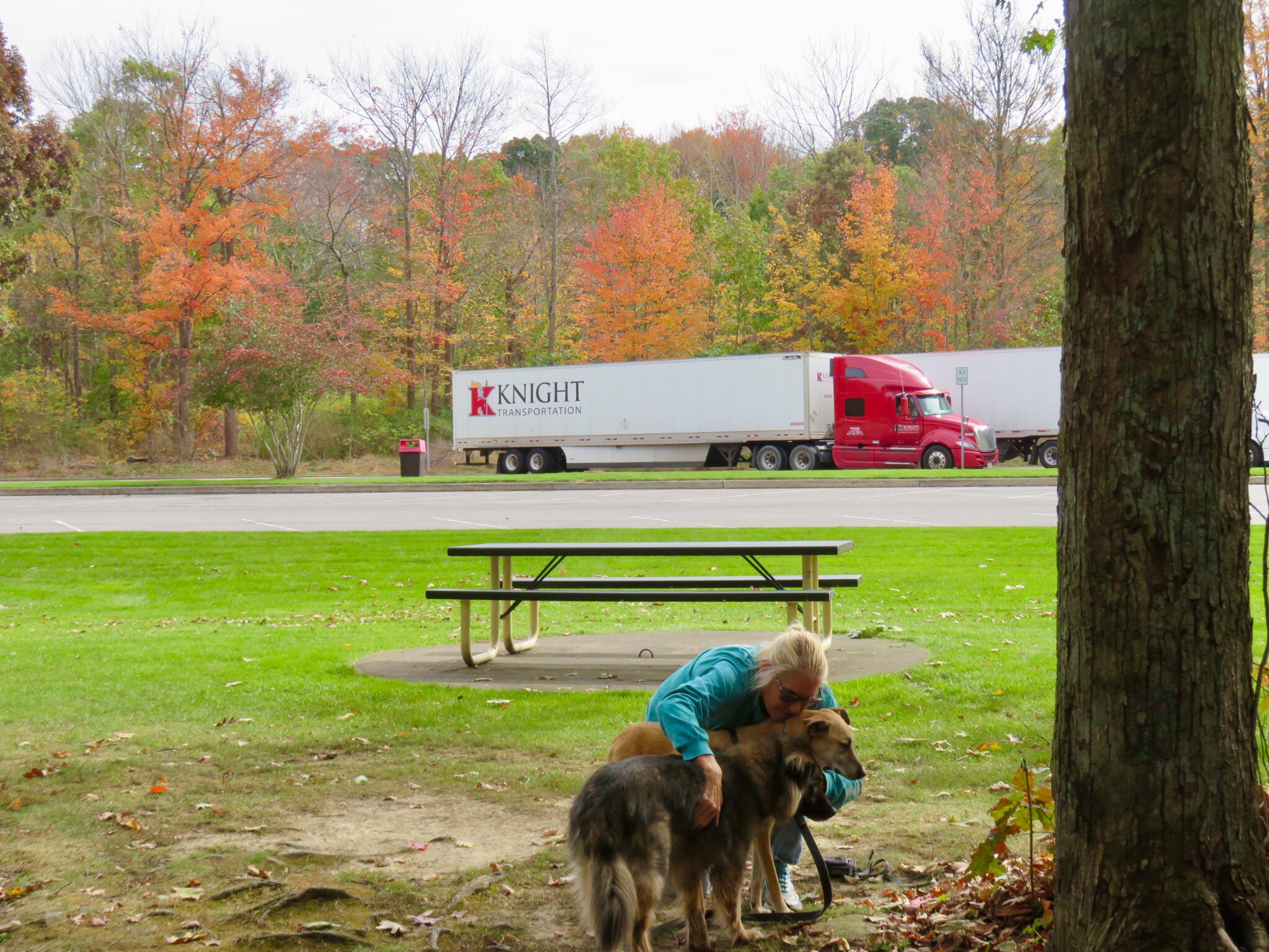 We made sandwiches at a rest stop just before the Ohio state line and sat at a bench and took a bit of a break. The dogs needed a respite as much as we did. Lots of travelers passing through and lines of semi trucks were idling in the lot. We didn’t tarry long and were back on the road in short order.