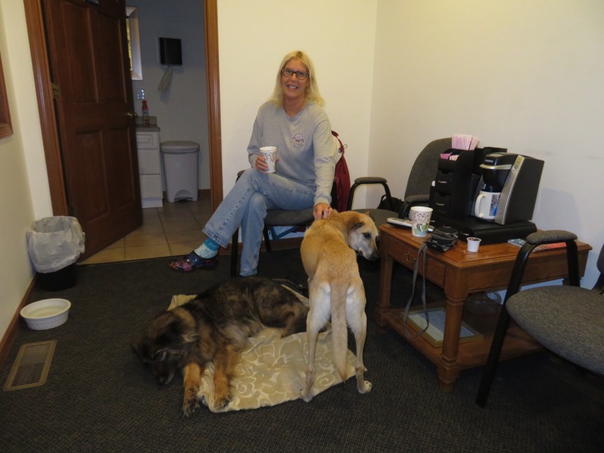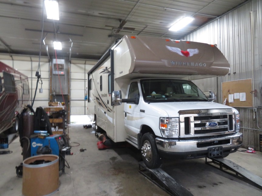 Michiana, that’s how the locals refer to this border area connecting the two states. The rain began falling in the pre-dawn hours and its tempo only increased as the day opened up. It was still dark out at 7:00 when we heard the roll up doors creaking to life as the crew was getting their day underway installing Bigfoot leveling systems on the collection of RVs they had in the shop. We loaded up a day pack with some books and snacks and walked over to the main office waiting room while Andy and AJ got busy installing the leveling system on Wilson.