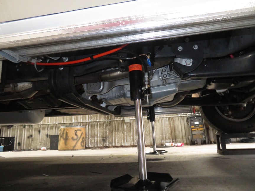 About two and a half hours later the installation was complete and Jeff took me over and explained the workings of the leveling jacks. Pretty straightforward, push the auto button and the jacks level up the coach. Good for rainy days like today because I don’t even need to go outside to get the RV level. As a bonus, I got the relay unit for the Tire Minder pressure monitor attached to the 12 volt terminals while the crew had the battery bay opened up. All in, an easy in and out operation.