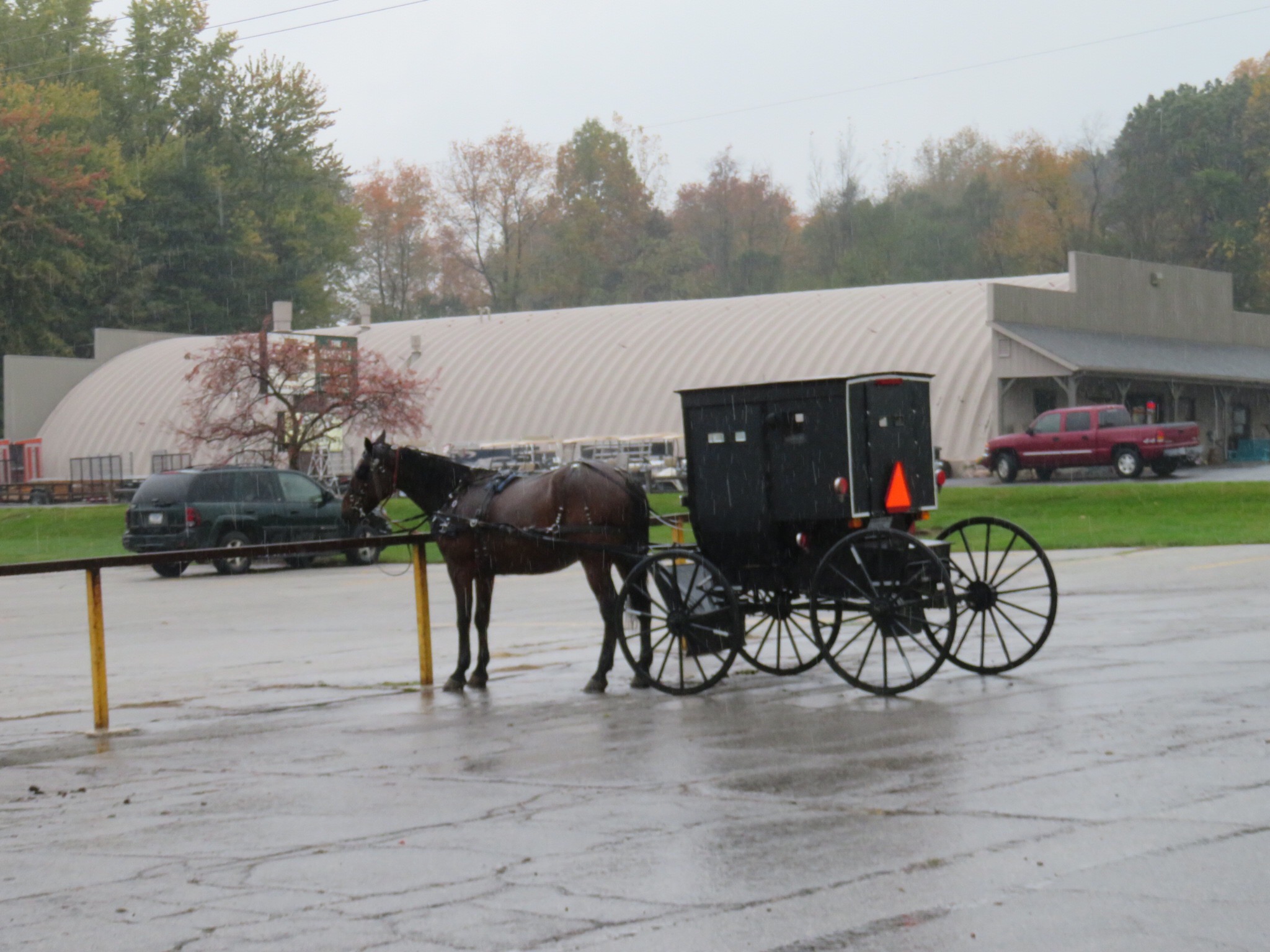 The rain was still pouring as we headed south down the one lane road. We figured to at least get a few miles behind us before holing up somewhere trying to keep dry. We sloshed our way through quiet communities with large Amish populations. PJ went in to do a shop at Harding’s supermarket in Warsaw, IN while I sat at the table and researched campgrounds an hour or two south. The main criteria being a concrete or at least gravel pad so we don’t sink into the mud. As I sat there googling, at least a dozen horse drawn buggies went clopping past holding up traffic on the main artery through town.