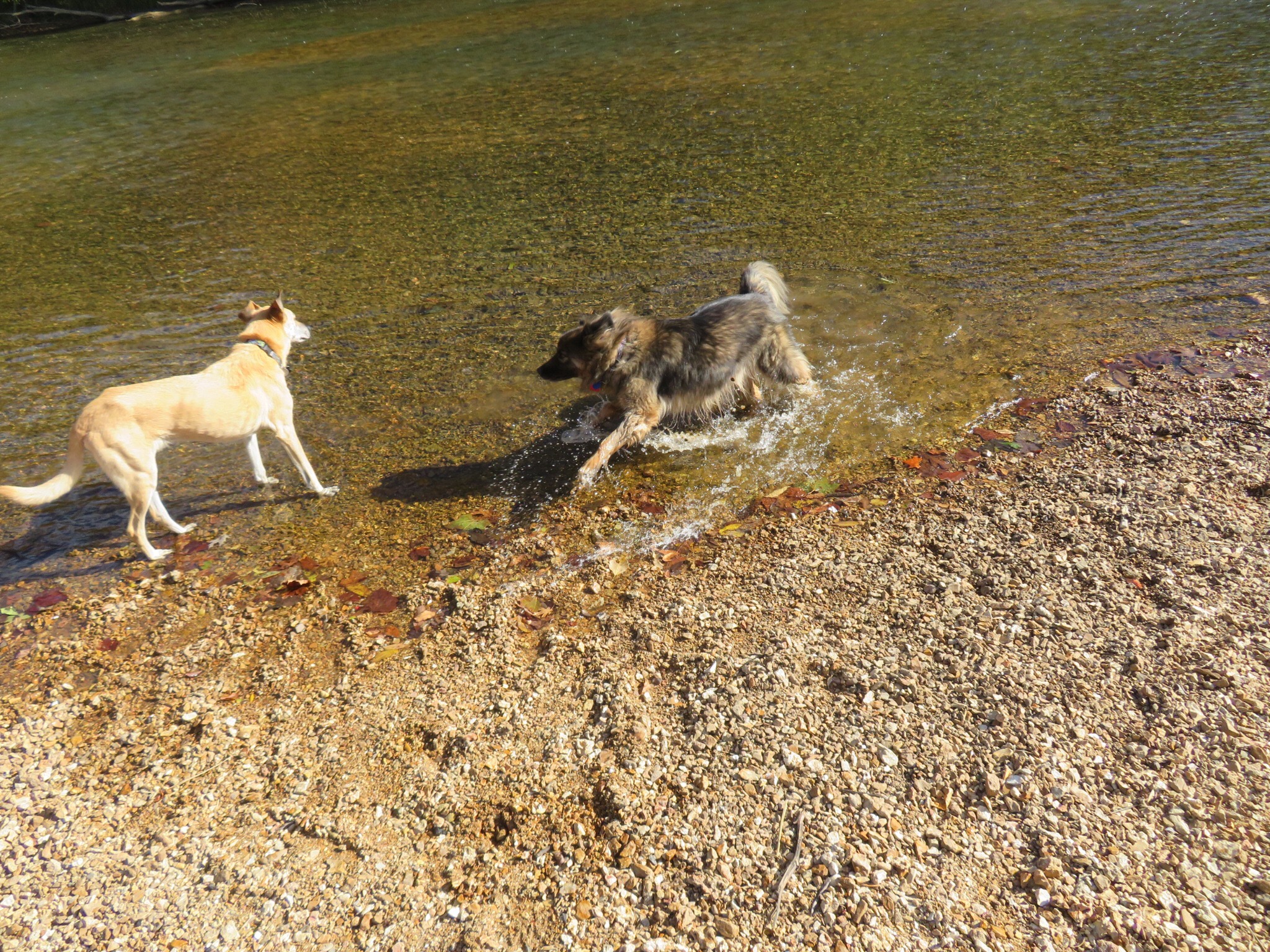 The carpets and gear from the storage compartments was dry so I put everything back in its place moving the electronics to a dry compartment. The dogs were looking a little energetic so we took them on a long hike up to the swim beach at the end of the campground. Koda was stoked to finally get in the water for the first time on the trip. The river was beautiful, you could see the bottom through the crystal clear water. After her swim Koda ran around like a puppy up and down the rocky shoreline trying to get a reluctant Cali to join in the frolic with minimal success.