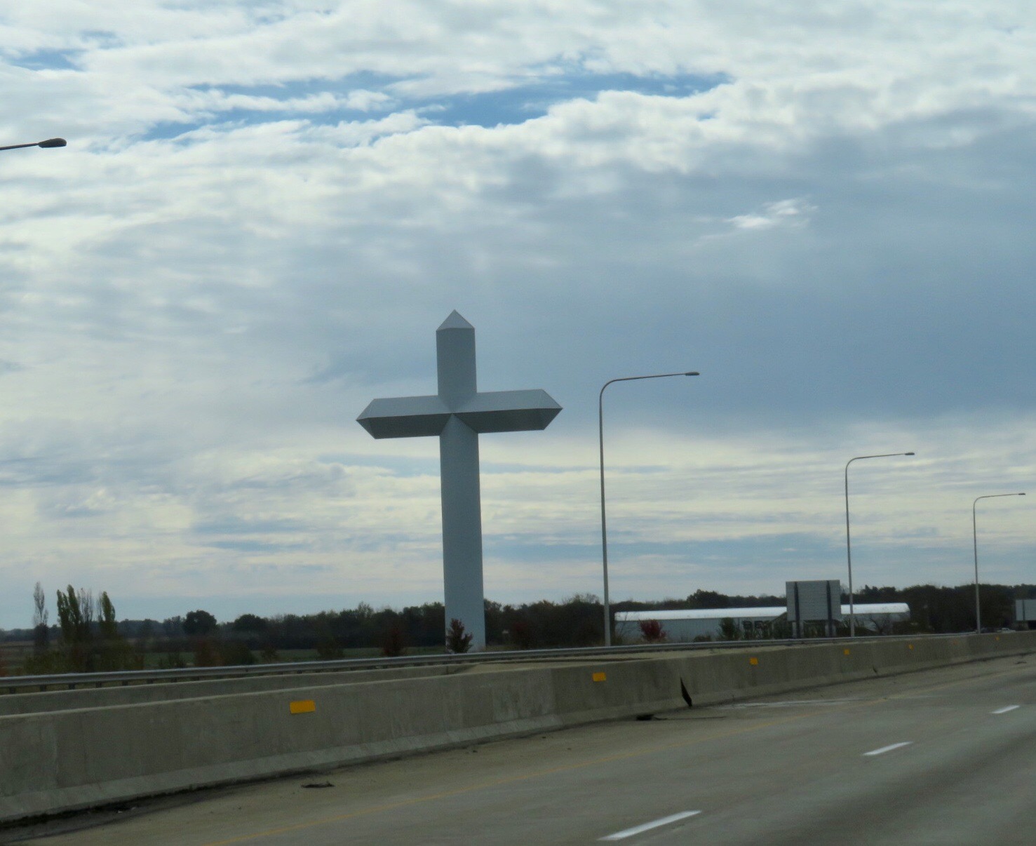 We gassed up out in the prairie and sat inside eating a quiet sandwich. Then back out into the weather for some more abuse. The rain has slackened off and the sun is threatening to poke its mussy head through the covering clouds. Traffic was thick going through St. Louis with lots of changing freeways to get out on the other side of the city. Look out world, we’re changing lanes. Actually, for the most part, people in the midwest are usually really good about letting a befuddled tourist get over where he needs to be.