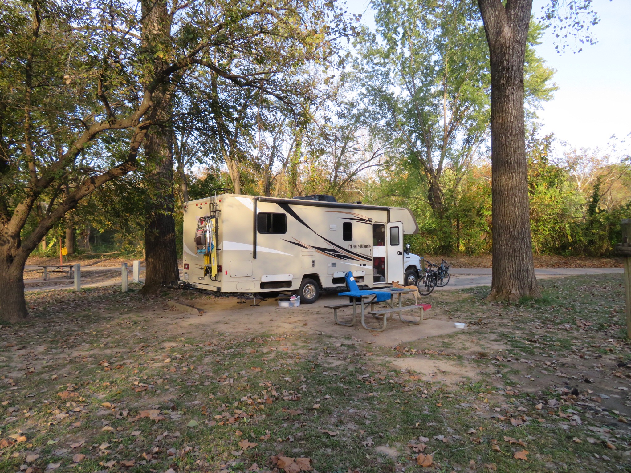 Today’s stop is Meramec State Park near Sullivan, MO one of my favorite stops on last year’s crossing from west to east. A huge expanse of meadow lined with giant trees that sits along the banks of the meandering Meramec River. We had a great stay here last year buzzing around on our bikes and swimming in the cool waters of the lazy river. Probably won’t be too much swimming going on this go round.